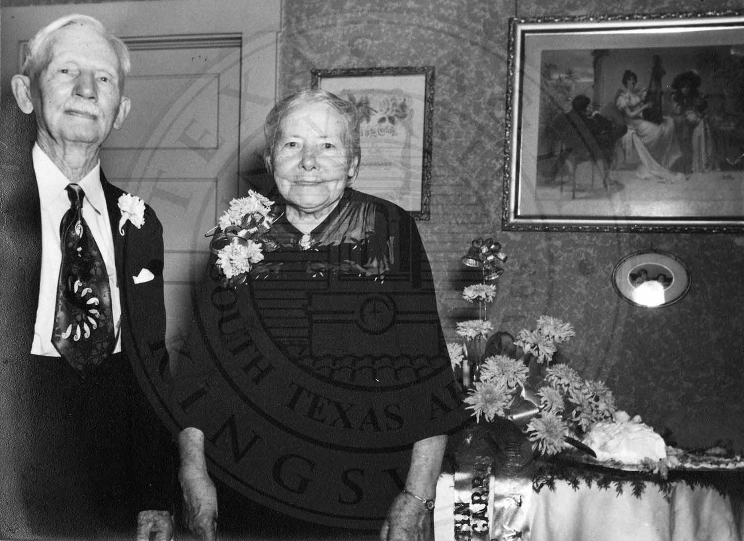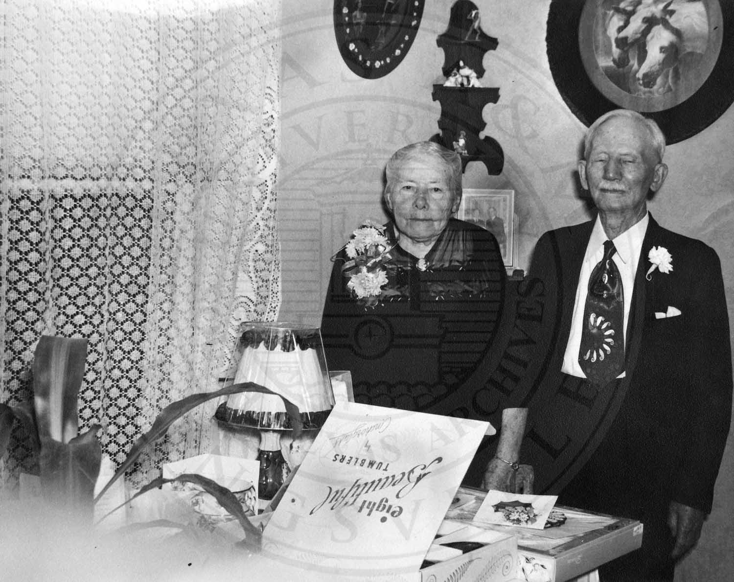 Elderly couple (Martin and Carrie Christopher) celebrating with presents around. 50th wedding anniversary celebration (1950). Caption says Mrs. Martin. |