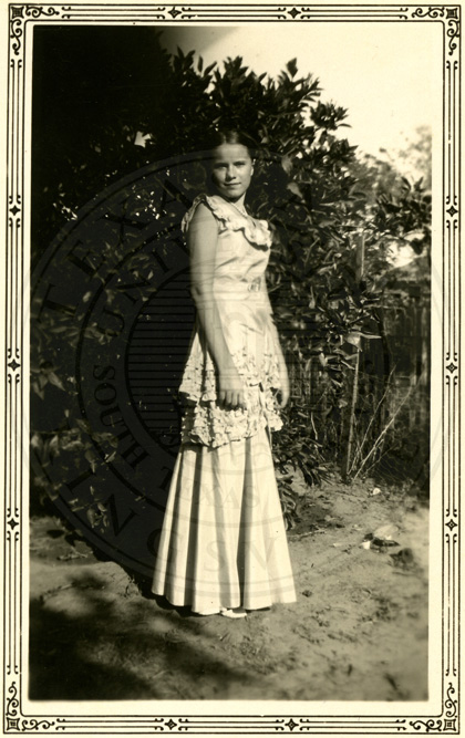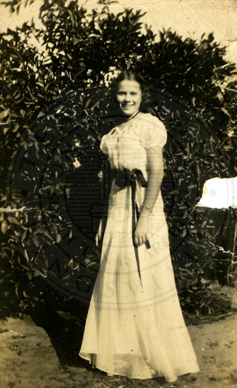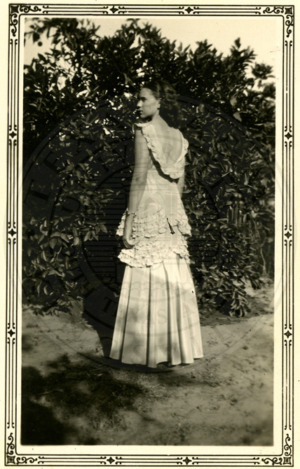 A2005-024.0048Collection: Benjamin F. Wilson Jr. Collection Location: A2005-024 STA Photo file | Young Florence (Collins) Wilson standing outside showing to advantage the back of her dress. |  |