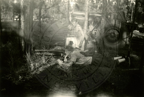 A2005-024.0063Collection: Benjamin F. Wilson Jr. Collection Location: A2005-024 STA Photo file | Unidentified men in training camp aiming a large machine gun. |  |