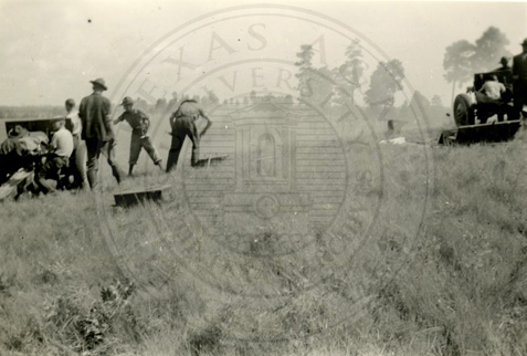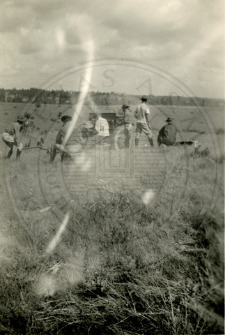 A2005-024.0067Collection: Benjamin F. Wilson Jr. Collection Location: A2005-024 STA Photo file | Unidentified men in training camp in field with a tractor. |  |