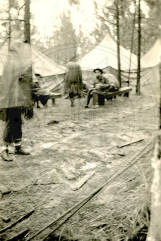 A2005-024.0066Collection: Benjamin F. Wilson Jr. Collection Location: A2005-024 STA Photo file | Unidentified men in training camp in uniform, sitting next to tents. |  |