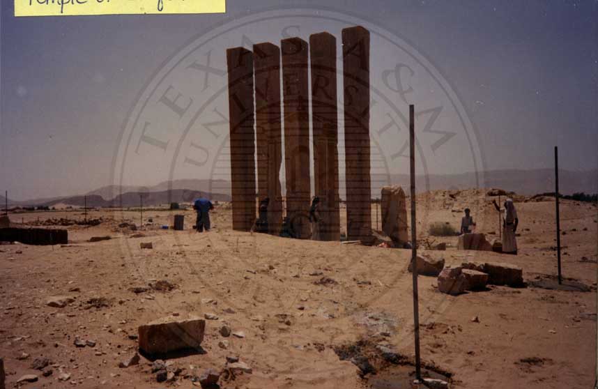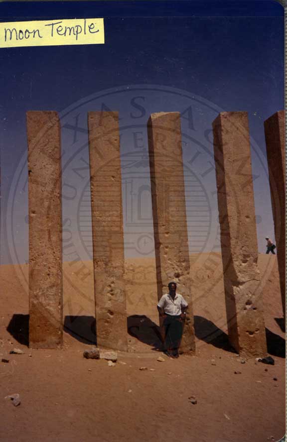 Candace Jefferson's travels to Yemen in 1988. The Sabaean Moon Temple at Marib [Yemen.] The alternate name is Five Pillars or Arsh Bilquis. Bilqis is the Yemeni name for the legendary Queen of Sheba. The structure is five tall megalithic pillars on a platform. |