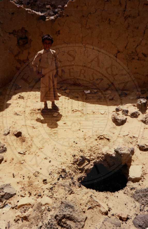 Candace Jefferson's travels to Yemen in 1988. A child standing next to an excavation hole in the old city of Marib. |