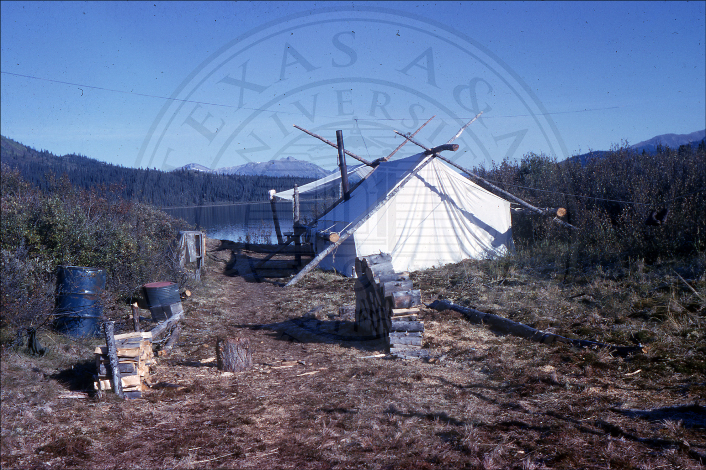 A camp and tent near a lake |