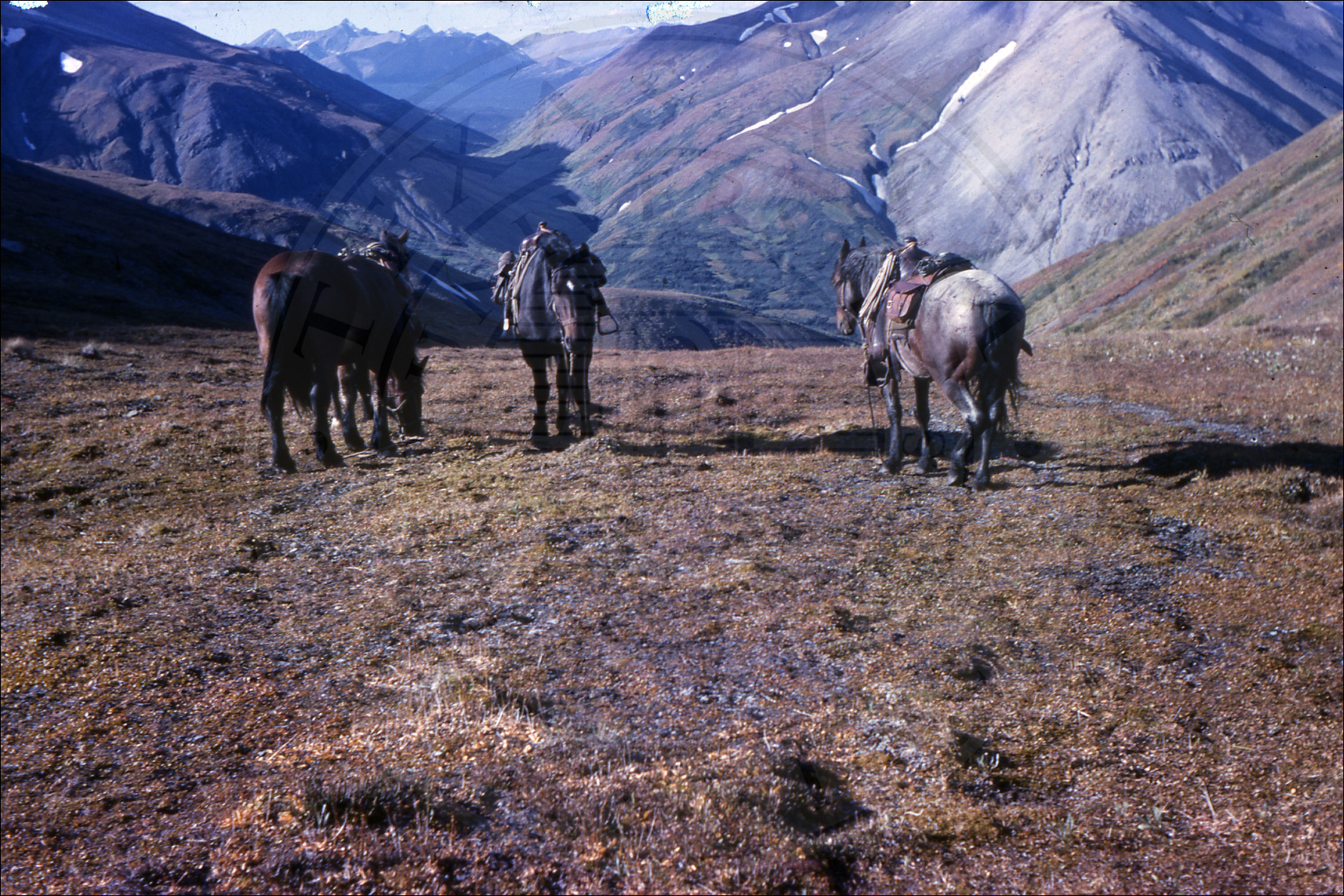 Three horses walking toward the mountain |