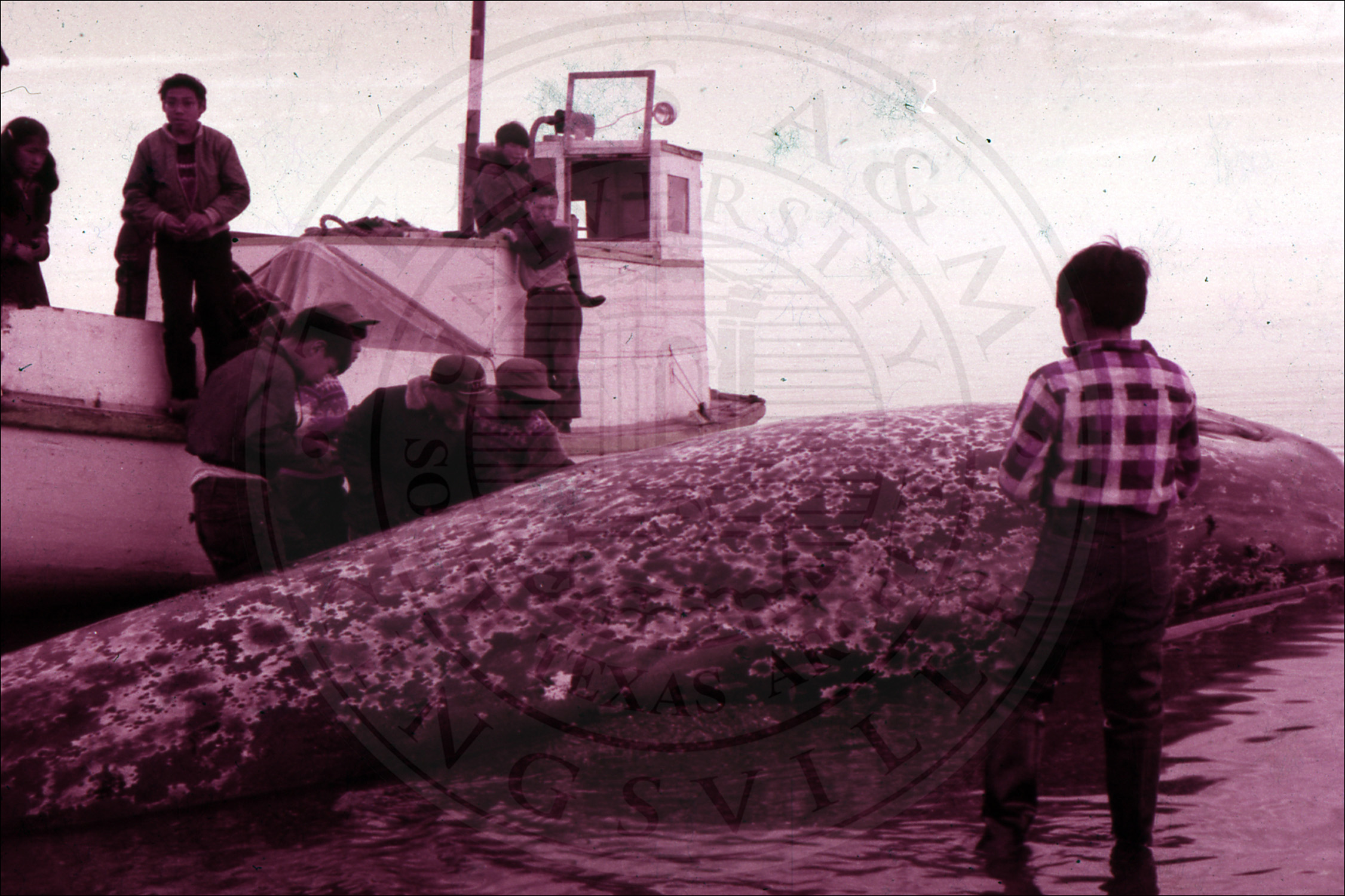 A whale caught by a group of people in a fishing boat |