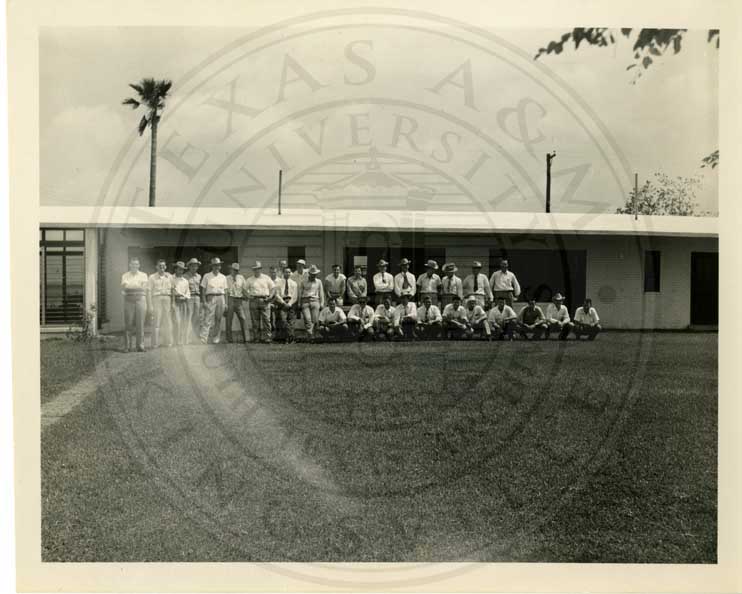 Group of men in front of building. |