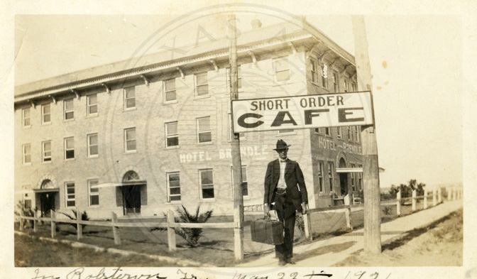 A man wearing a coat and a hat is standing. He has a suitcase and what looks like a newspaper in his right hand. He is standing under a board which reads " SHORT ORDER CAFE ". In the background is a hotel building with the name " HOTEL BRENDLE ". |