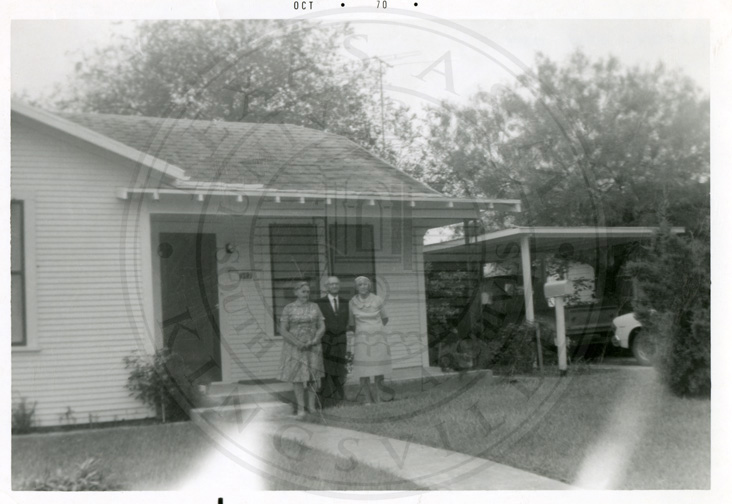 Caption on front, " OCT 70 ". A man and two women standing outside a house in the garden. |