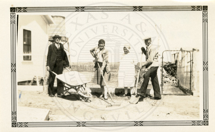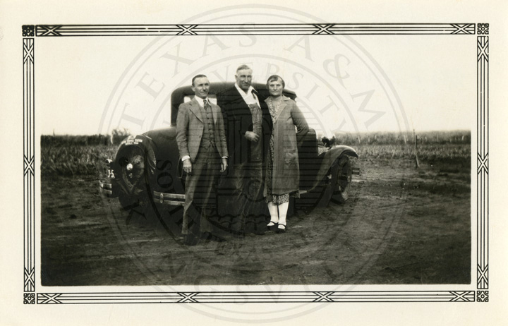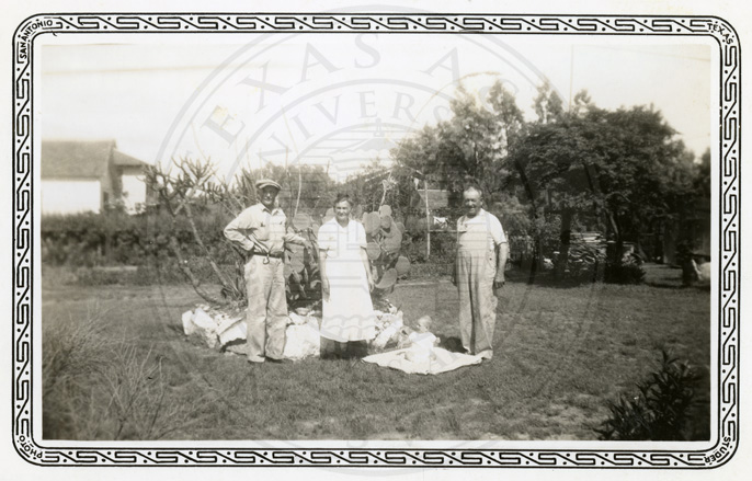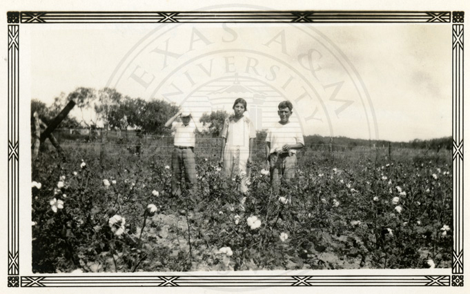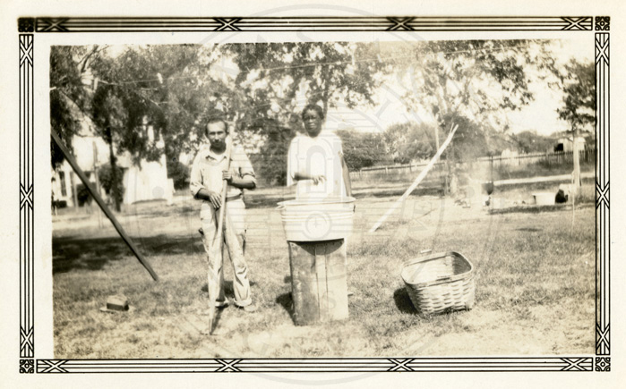 Caption on back, " This is Mandoza & Patra and Laurance Elling in our cotton patch ". |