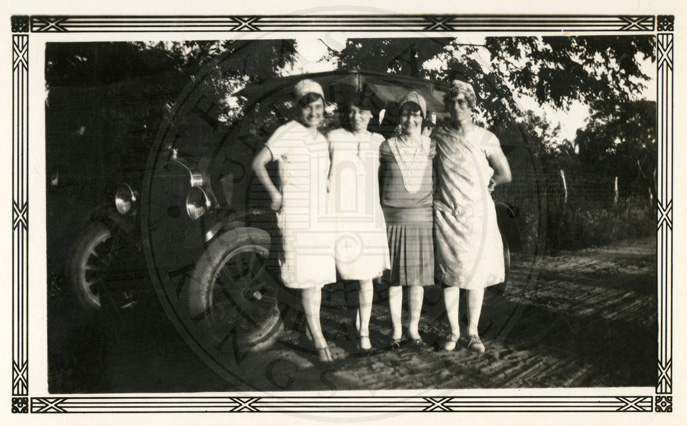 Caption on back, " Mrs Fred Elling & Mr & Mrs John Schnaskus & a stranger " |