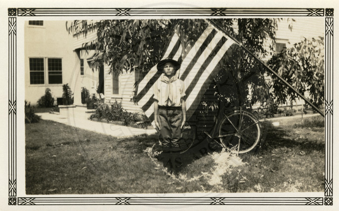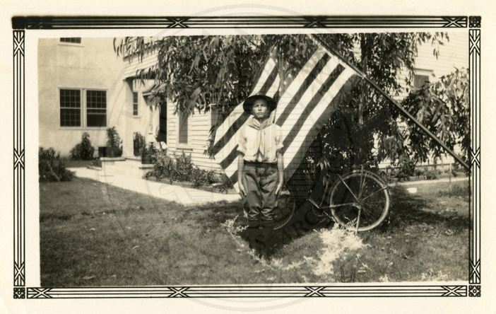 A boy wearing a scout uniform and a hat. He is standing outside a house. The boy is standing in front of the US flag. |