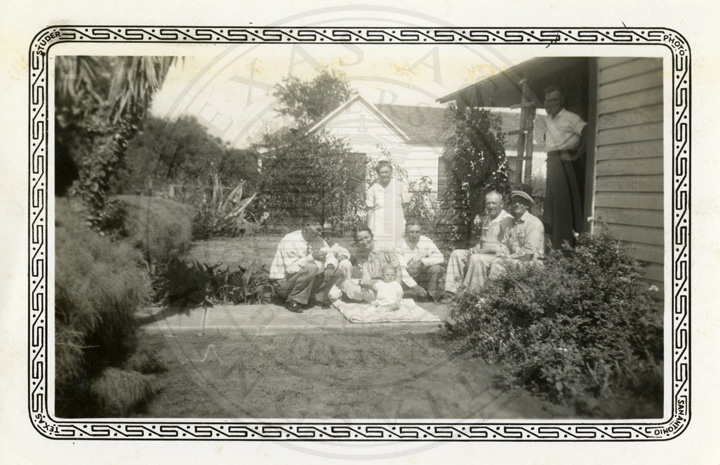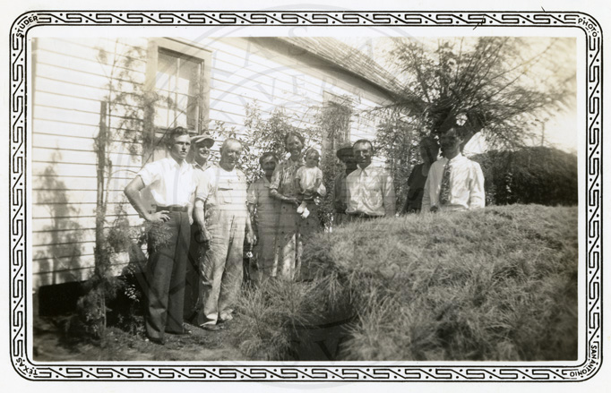 Six men and three women standing outside a house. The woman in the center is holding a baby in her hand. |