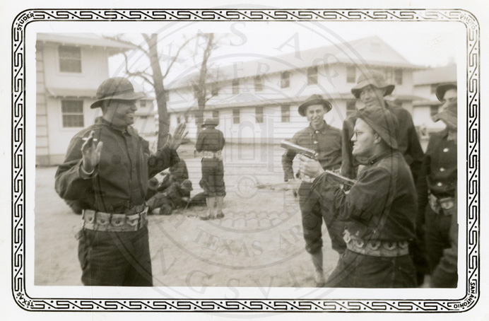 Caption on back, " Recess. The fellow on the left is the married man that I told you about. The one that has the little girl. He's a ? fellow on the right is Roemer from Kingsville - with the gun in his hand. ? just ? him " |