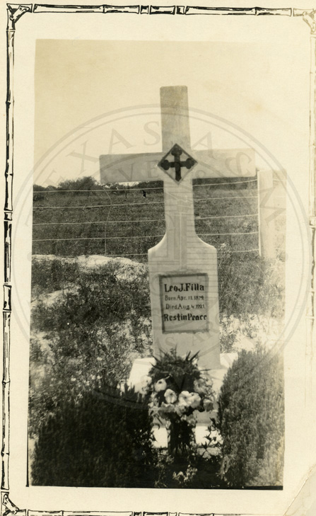 Tombstone with the epitaph "Leo J. Filla Born Apr. 11. 1879 Died Aug. 4 1921. Rest in Peace." |