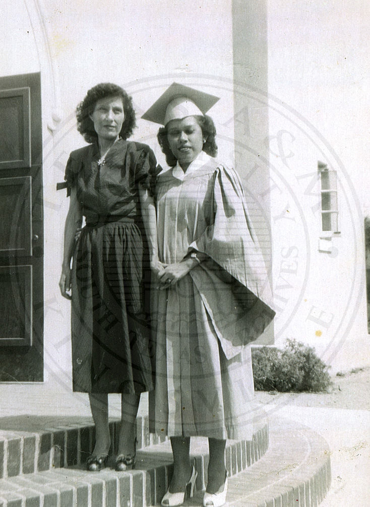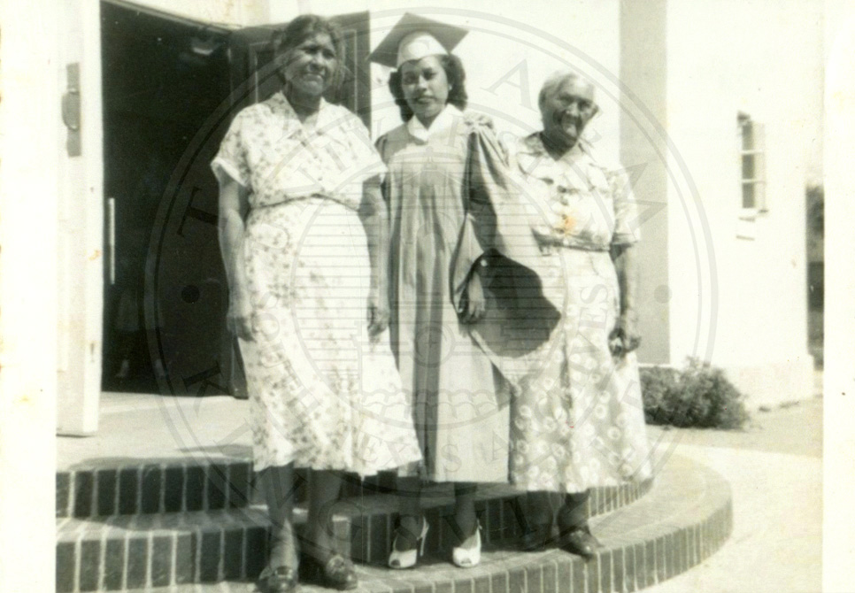 Maggie Salinas, wearing camp and gown, in the middle of two unknown women |