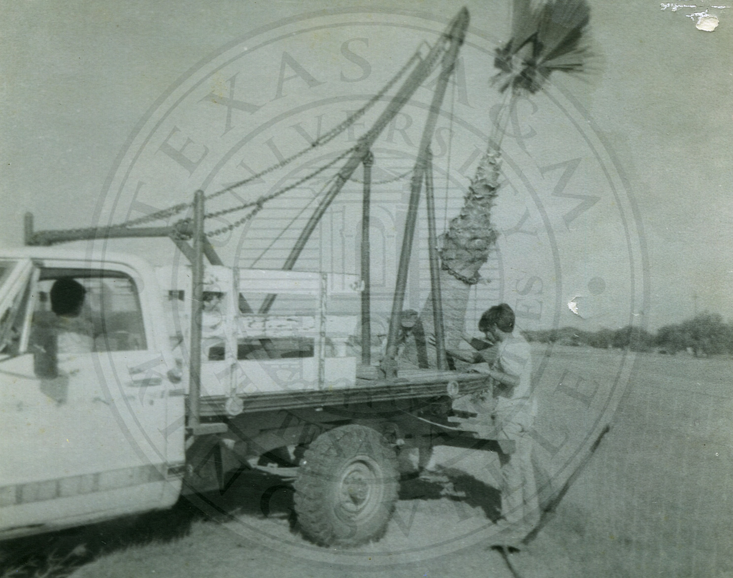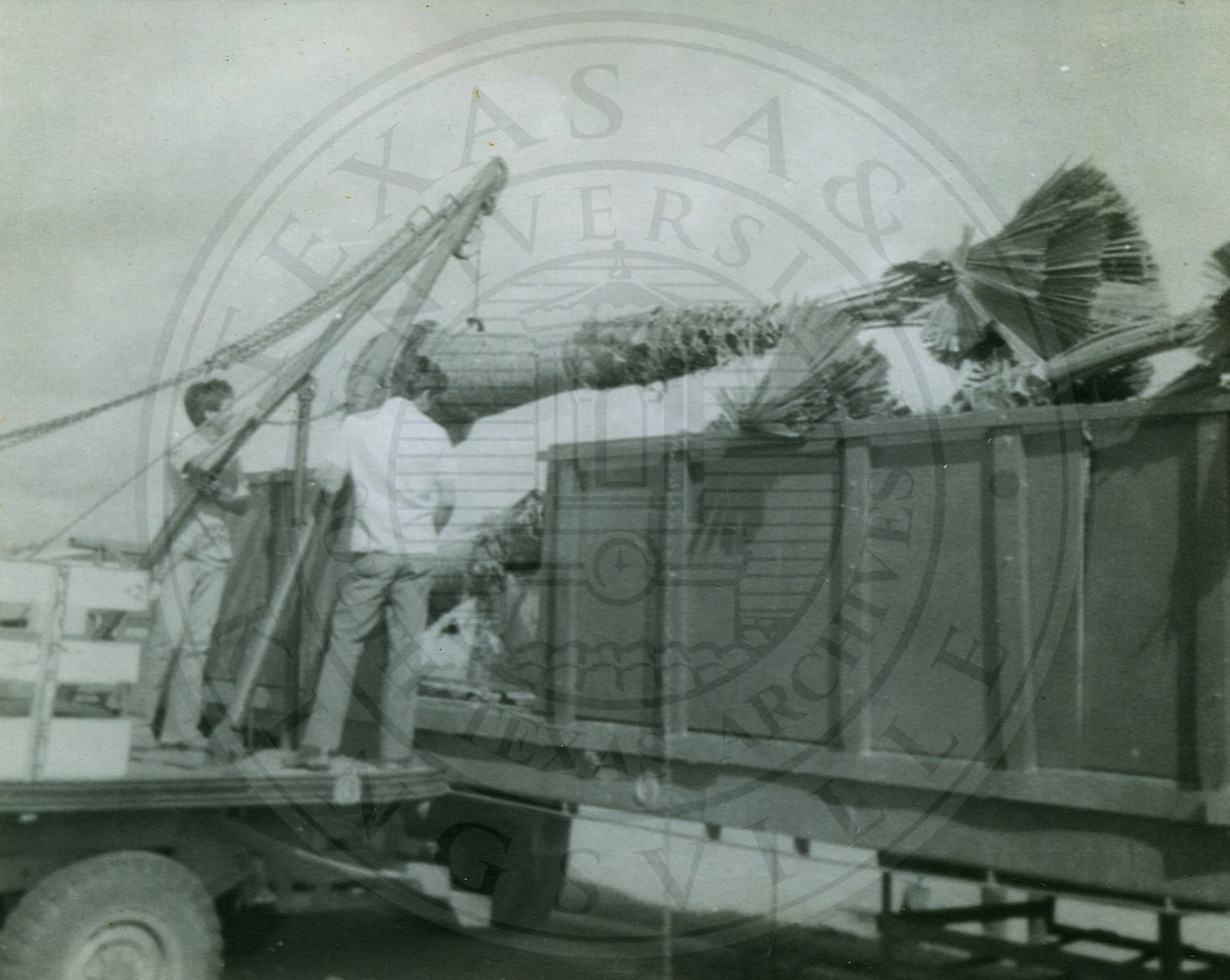 Parque Hermanos Flores. Two unidentified men moving a palm tree hanging from the back of a truck |