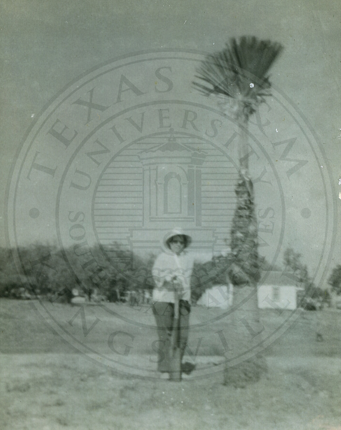 Parque Hermanos Flores. Unidentified woman standing next to freshly planted palm tree |