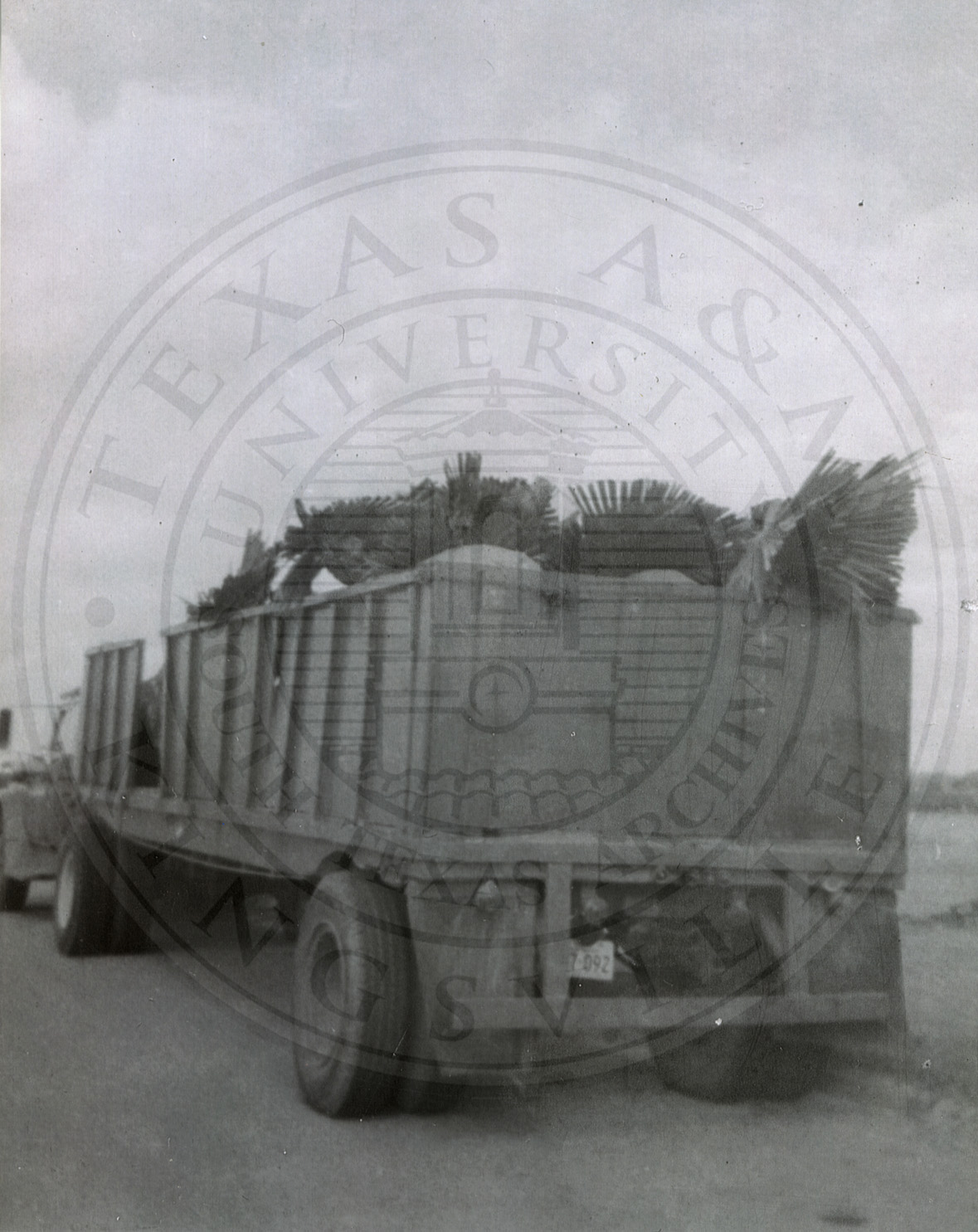 Parque Hermanos Flores. Truck with a bunch of palm tress laying in the back |