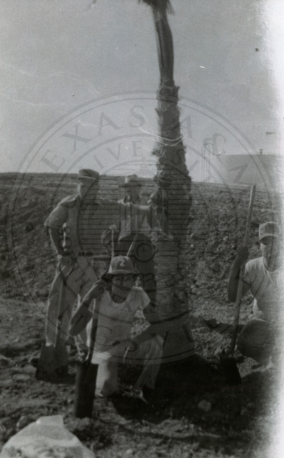 Parque Hermanos Flores. Unidentified men with shovels standing around a freshly planted palm tree |