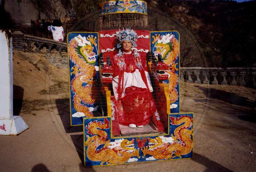 (Dawn?) sitting in Oriental garb. Taken at the Great Wall of China. Attached to a greeting card which reads "Surprise! My decree is for: Health and Happiness to find and stay with you in 1999! (Dawn?) |