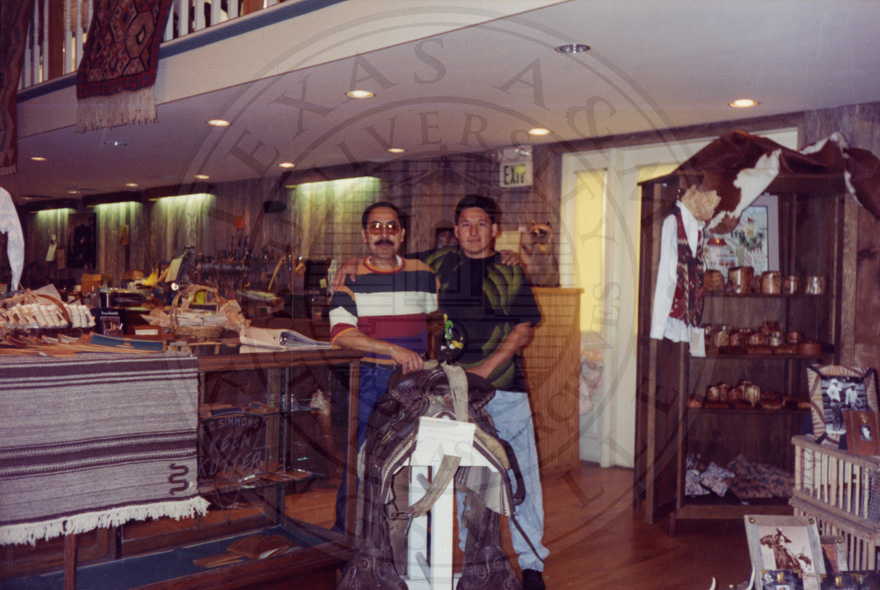 Two unknown men standing behind a saddle. Looks like they are in the King Ranch Saddle Shop |