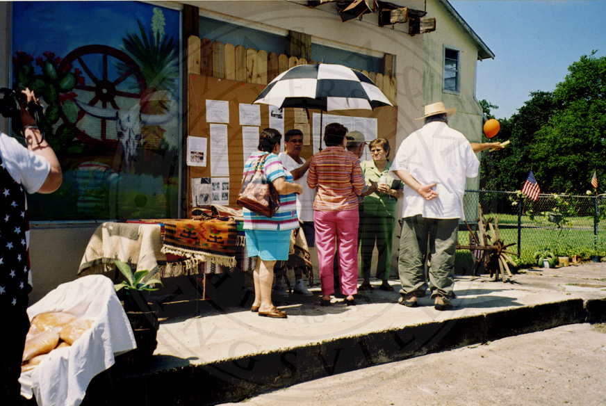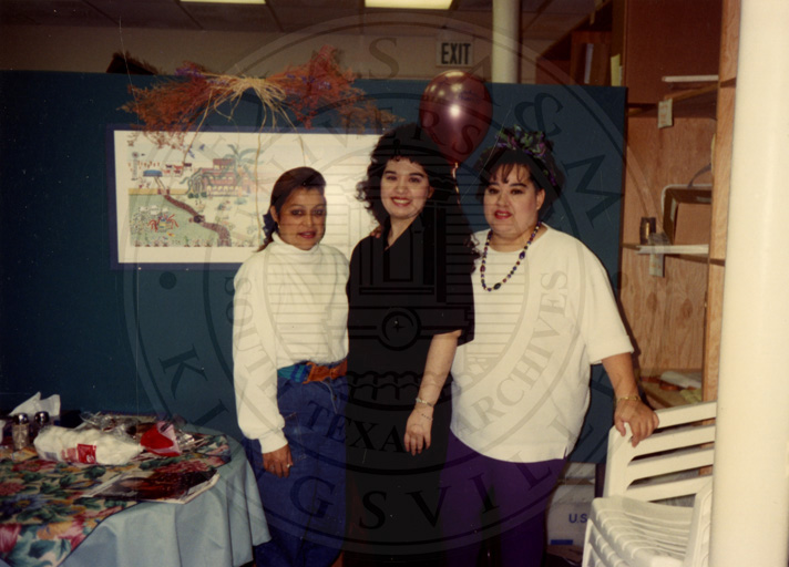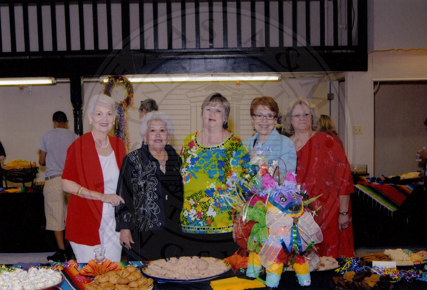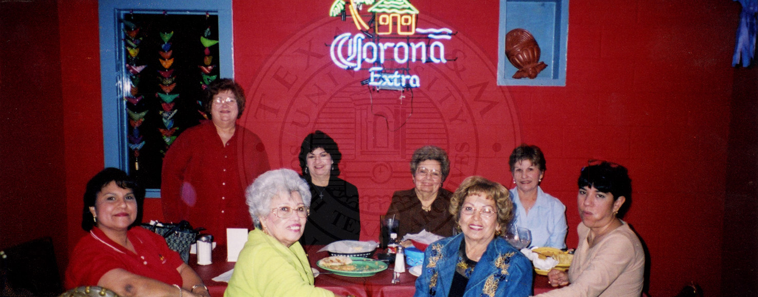Maggie Salinas with several unidentified women. Caption on back "Coffemantes @ El Jardin" |