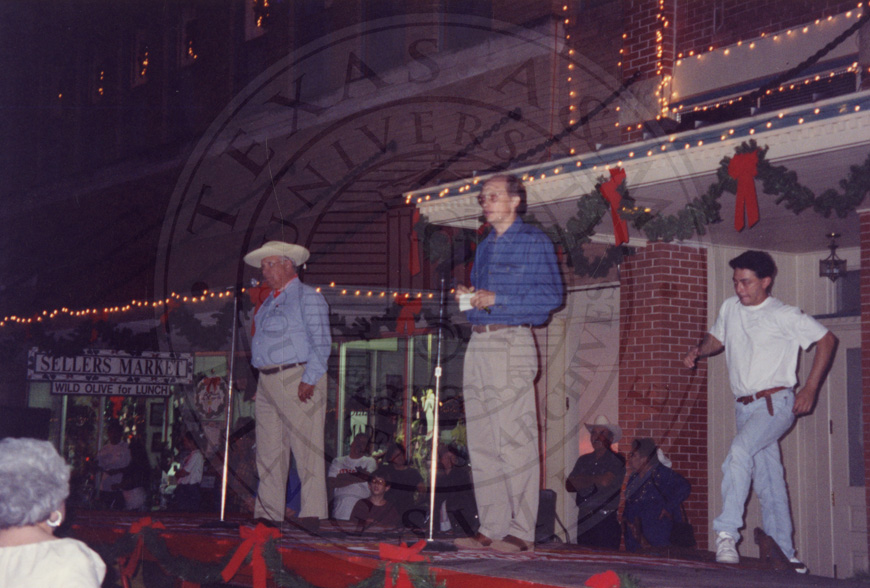 La Posada Pictures. Three unidentified men on stage with Christmas decorations |