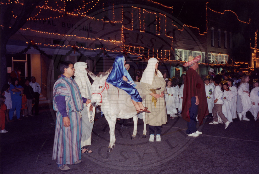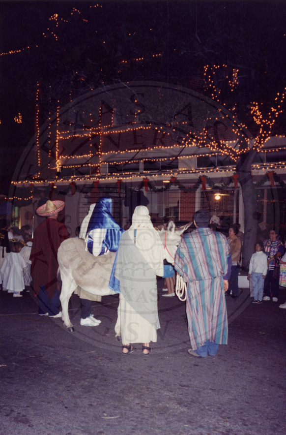 La Posada Pictures. Christmas Parade with Mary and Joseph on a donkey leading the procession |