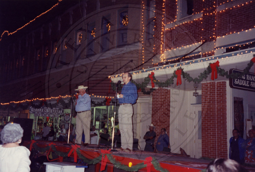 La Posada Pictures. Two unidentified men standing on a stage surrounded by Christmas lights and decorations |