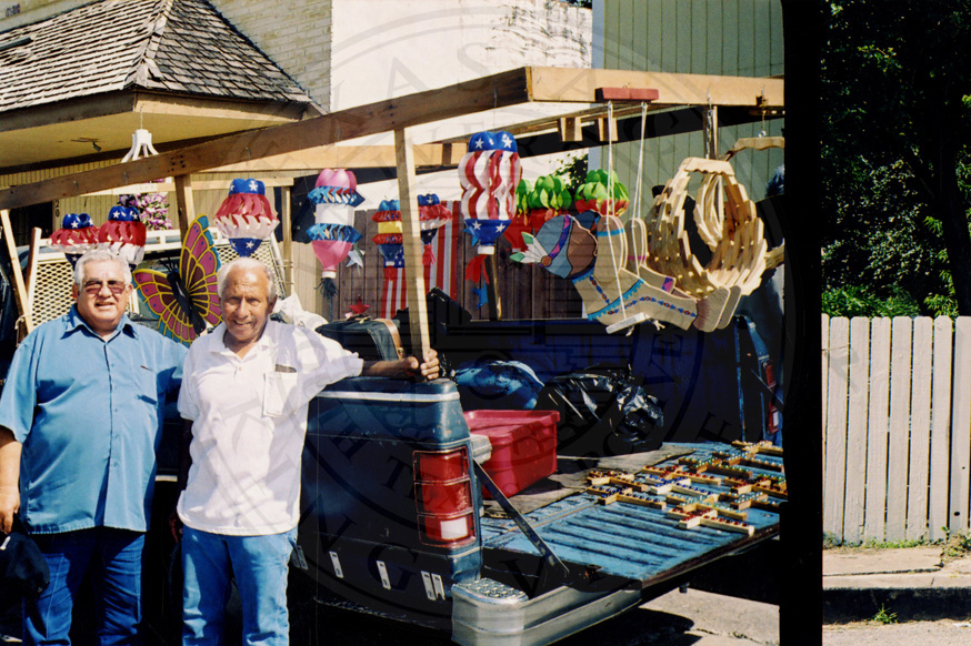 Two unidentified men standing next to a truck with handmade merchandise. |