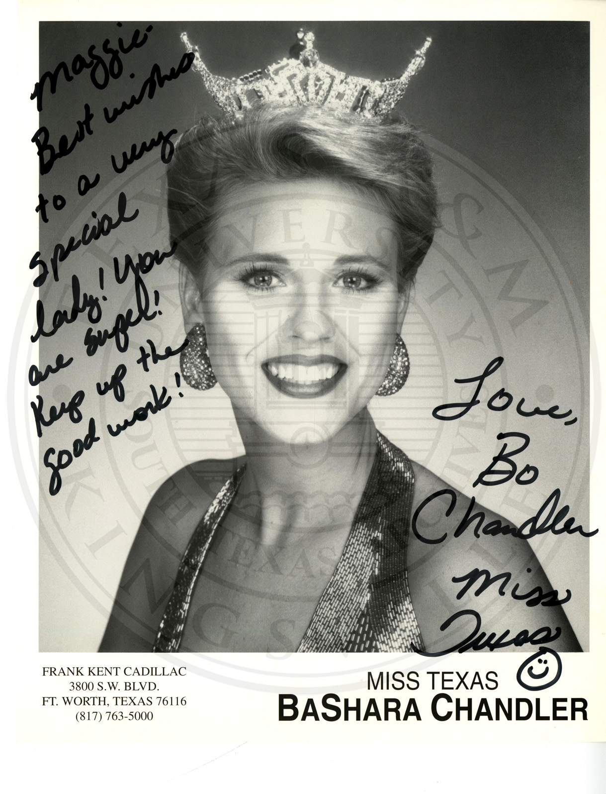 Head shot of Miss Texas Bashara Chandler. Written on photo "Maggie best wishes to a very special lady! You are super! Keep up the good work Love Bo Chandler Miss Texas" |