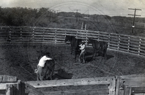 These colts are rounded up each week. They teach them to lead and eat oats. They pick up their feet and otherwise handle them. The purpose of all this is to gentle the colts so that when they are ready to be broken they are not so hard to handle.