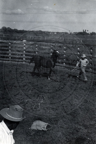 Throwing or making this 1/2 year old colt lay down. Gentling him. Nov. 1943