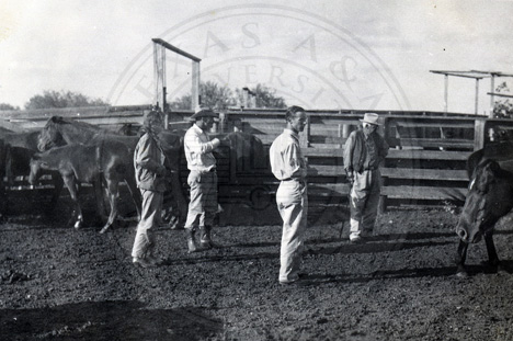 Tommy Tate, Ed, Sam Millar and Mr. Caesar (Kleberg) admiring the gate of Ranchero, a fine stallion.
