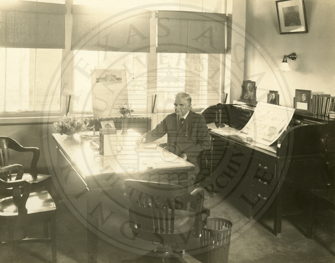 Dr. Cousins sitting at his desk in main buidling, administration offices. |