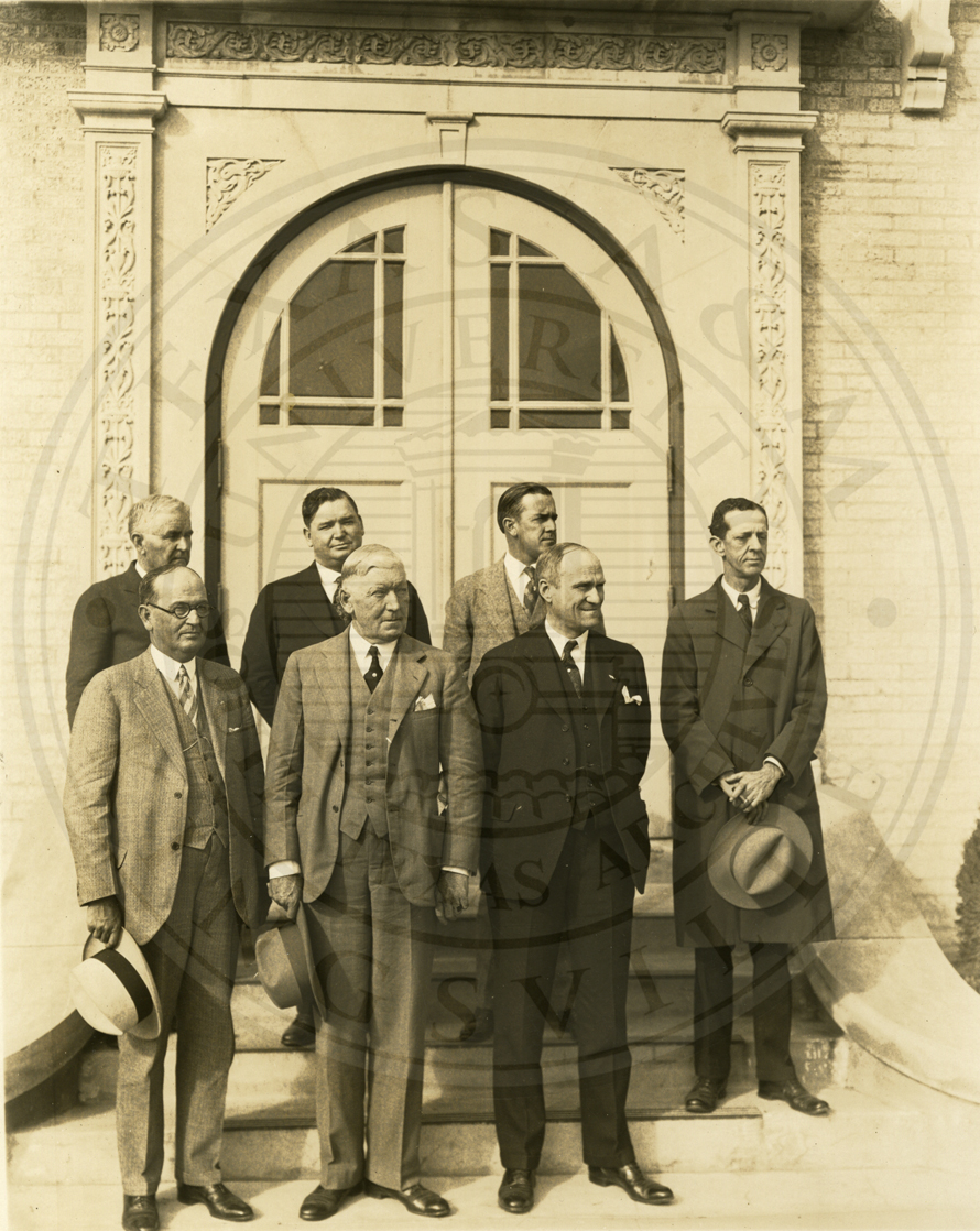 Board of Regents standing in front of Library. Back row on left is Dr. Cousins, Sam Fore, H. A. Turner. Front row, Martin, Flowers, Hays. |