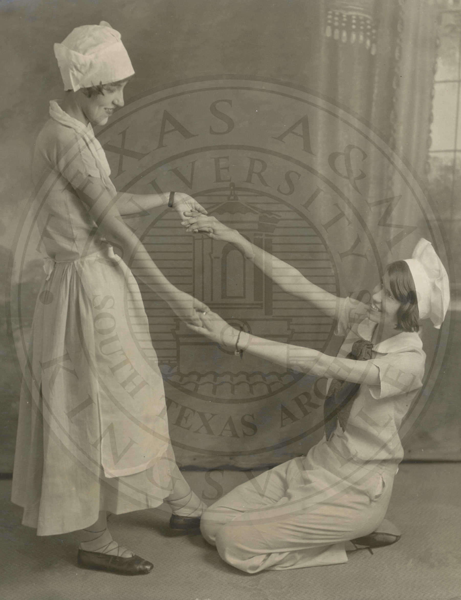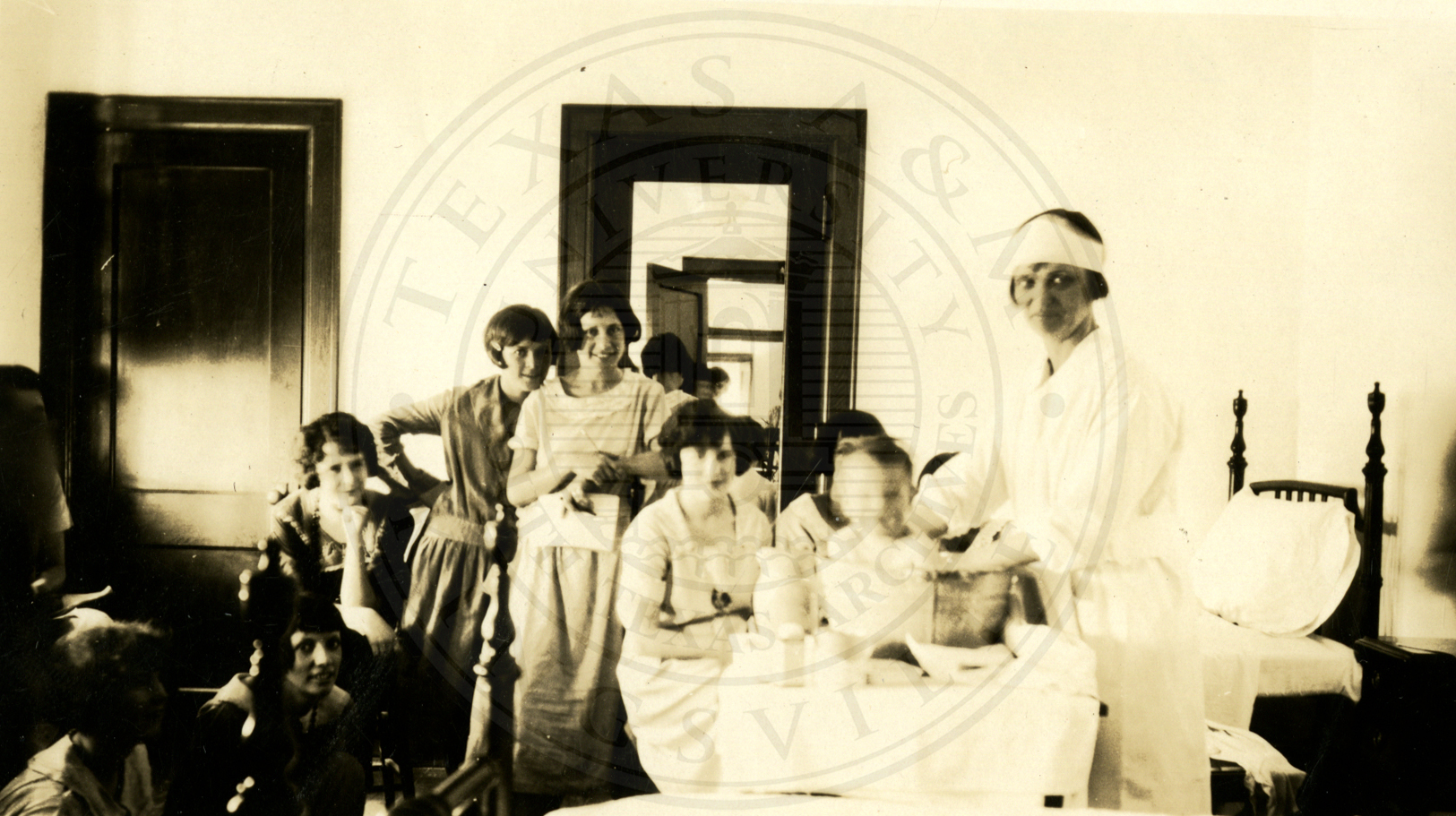 Home nursing class in which young women learned about home nursing and child care. Six young women around nursing bed. |