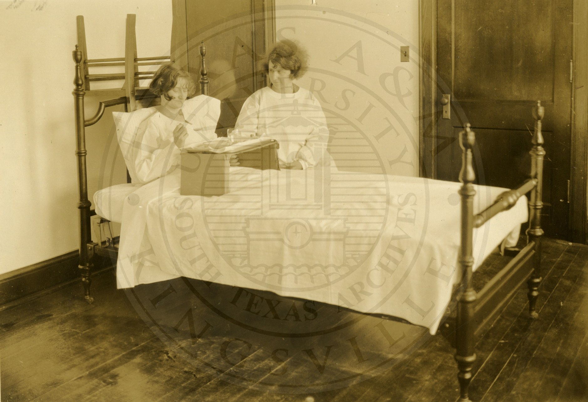 Home Nursing Room, Manning Hall. One young woman in bed and another sitting beside her. |