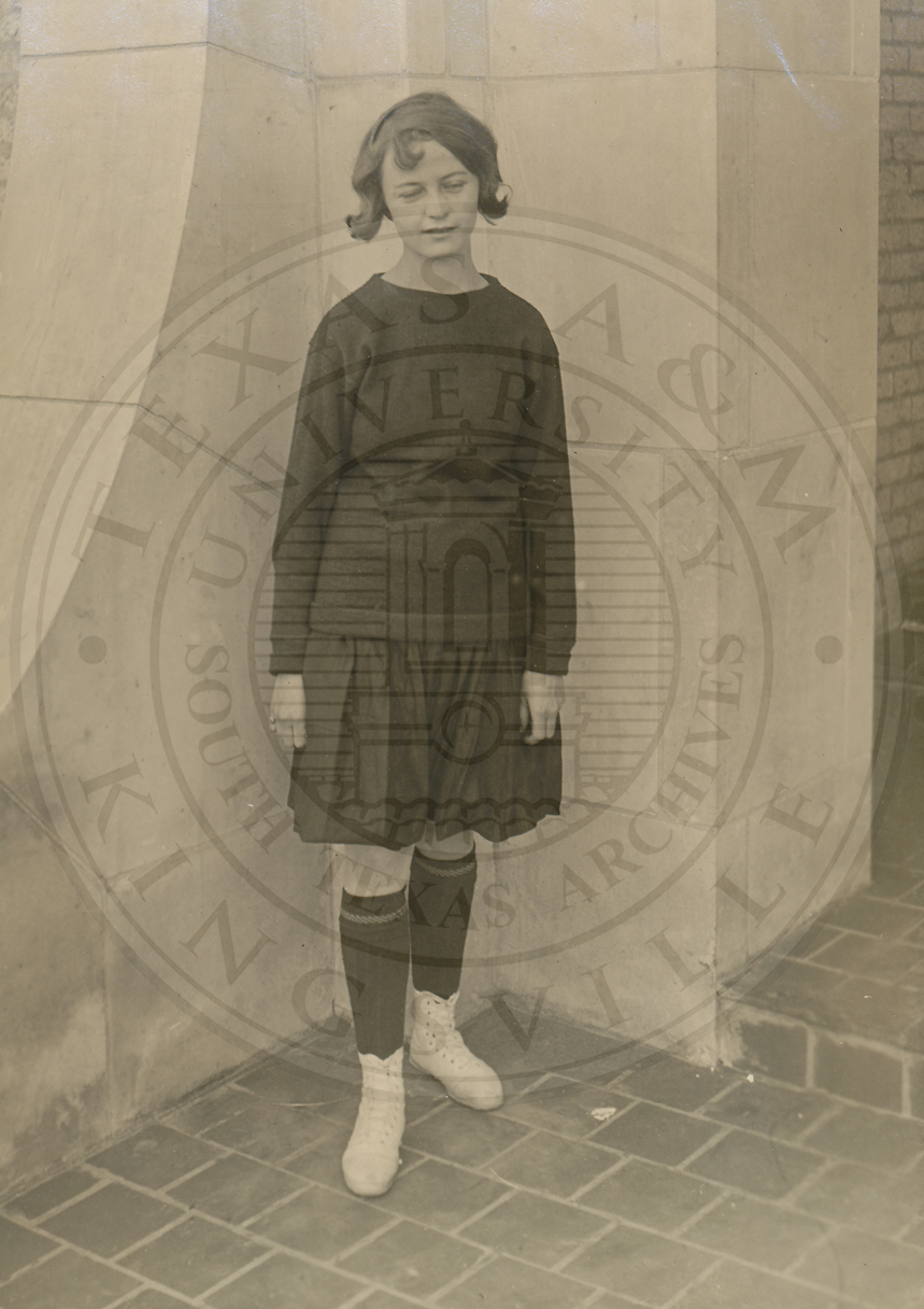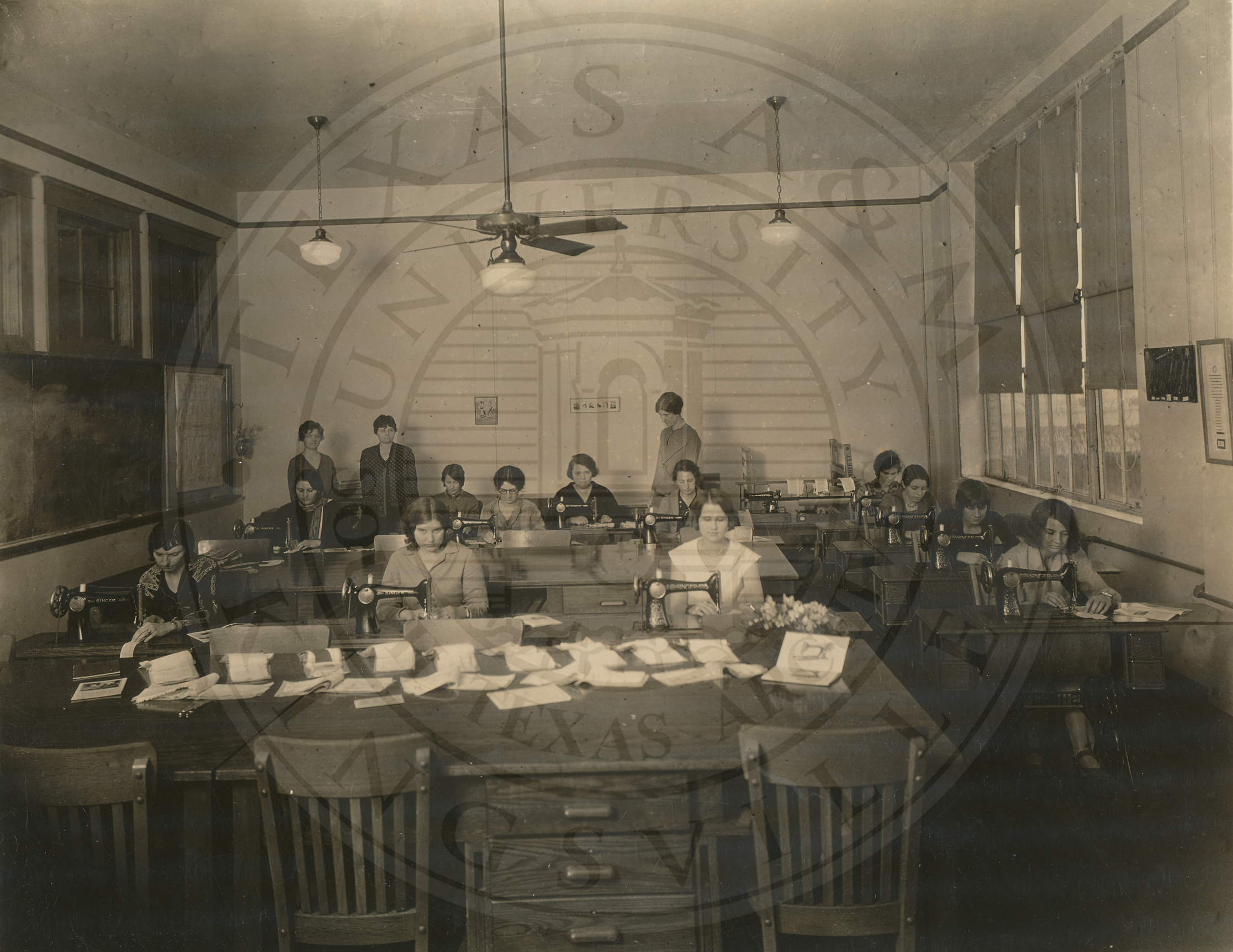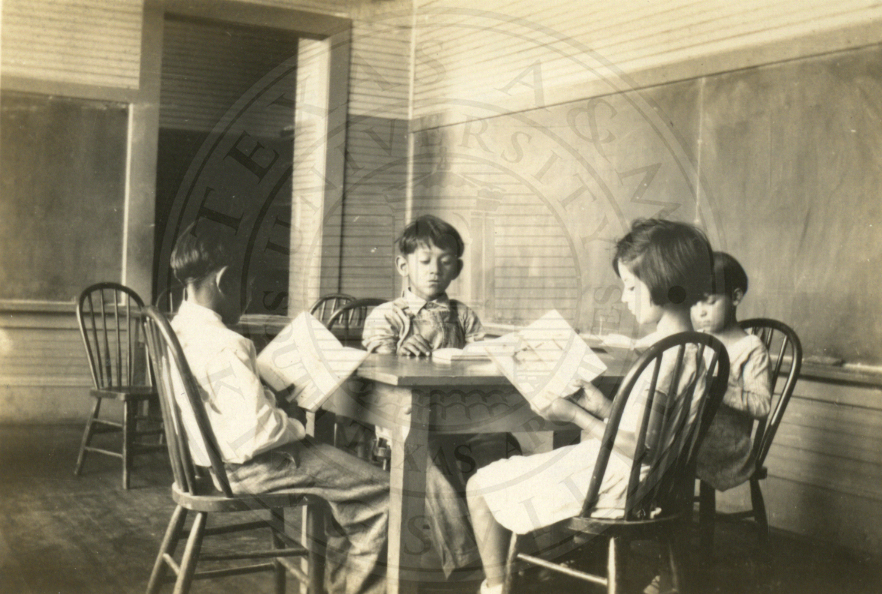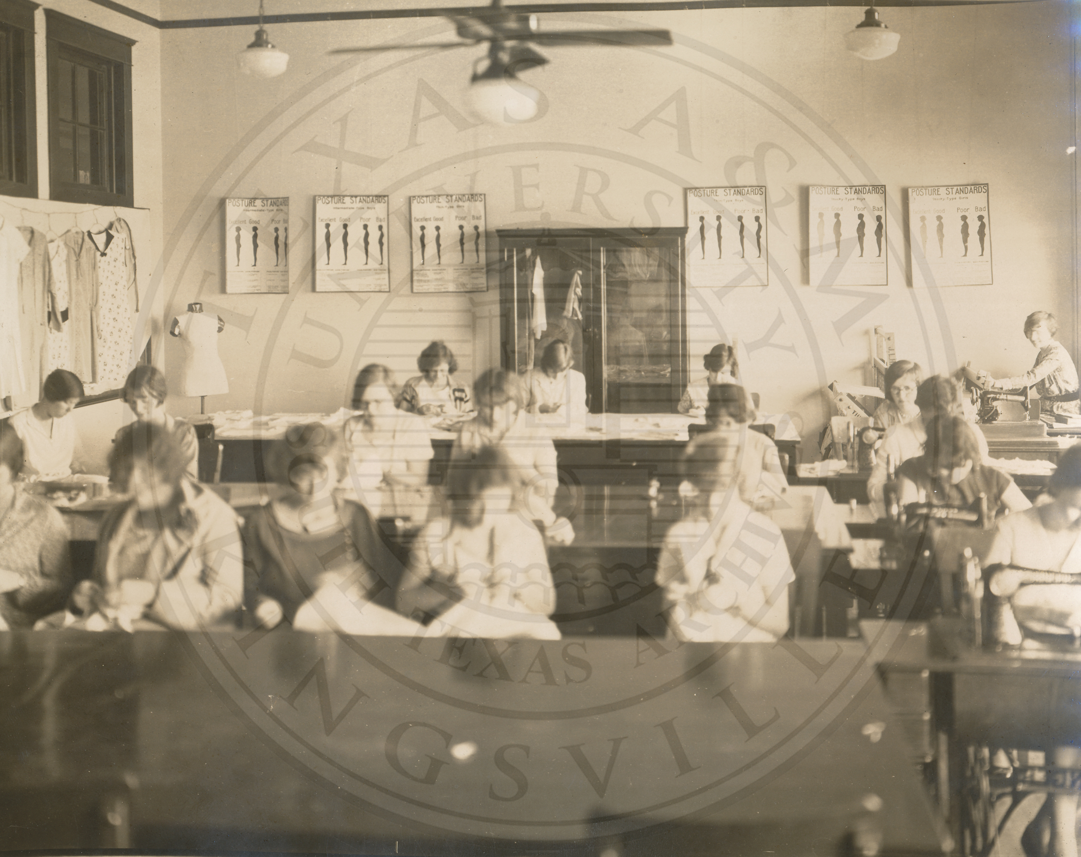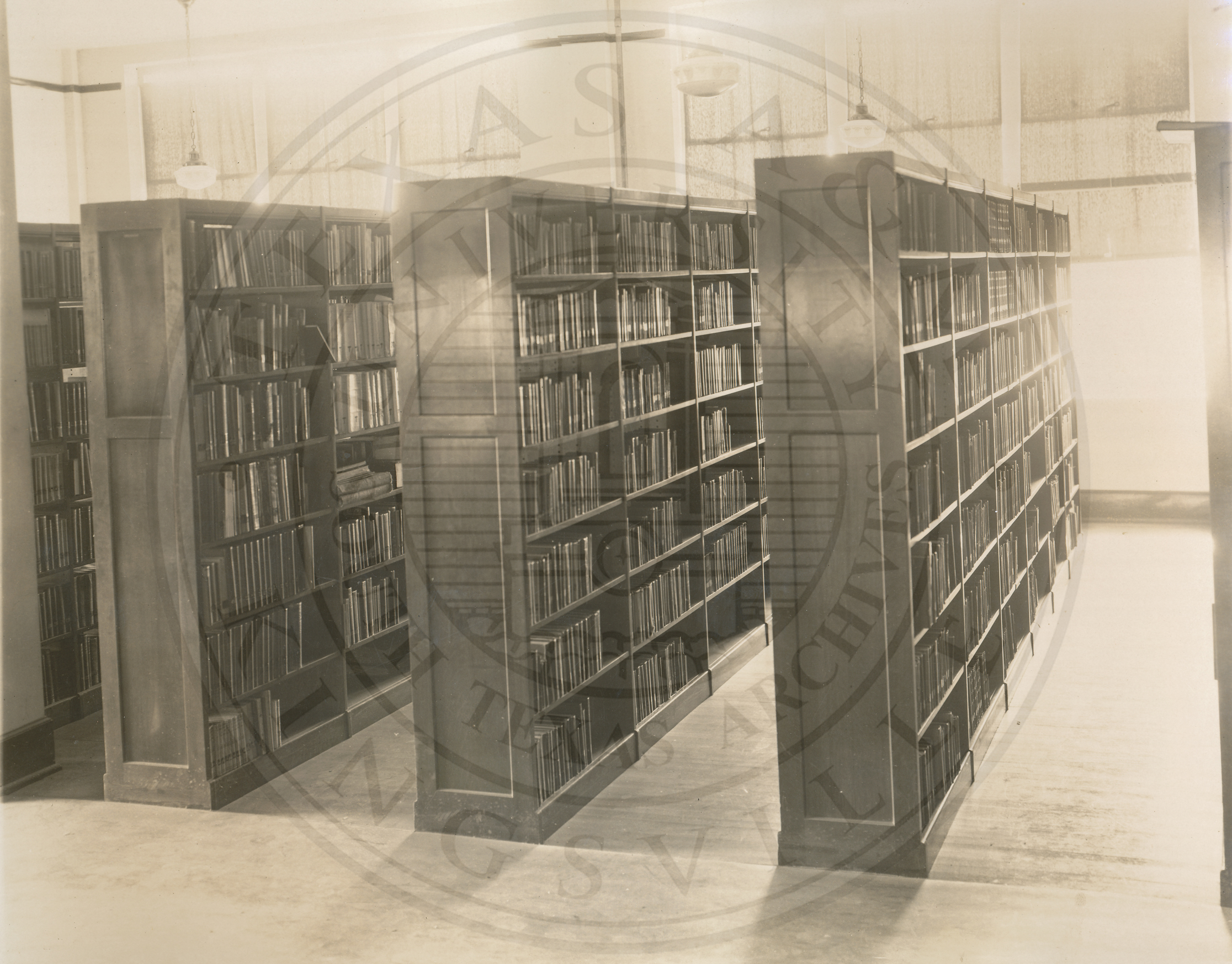 1927 view of South Texas State Teacher's College library bookshelves. |