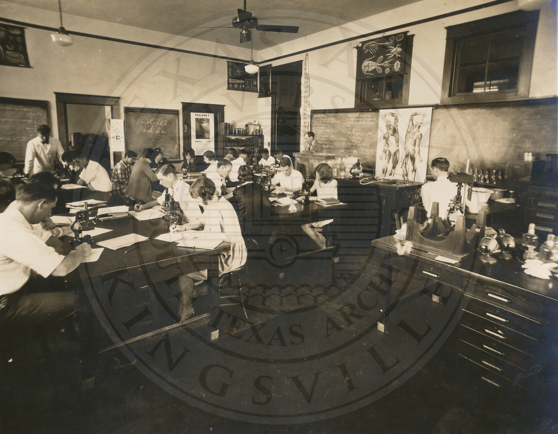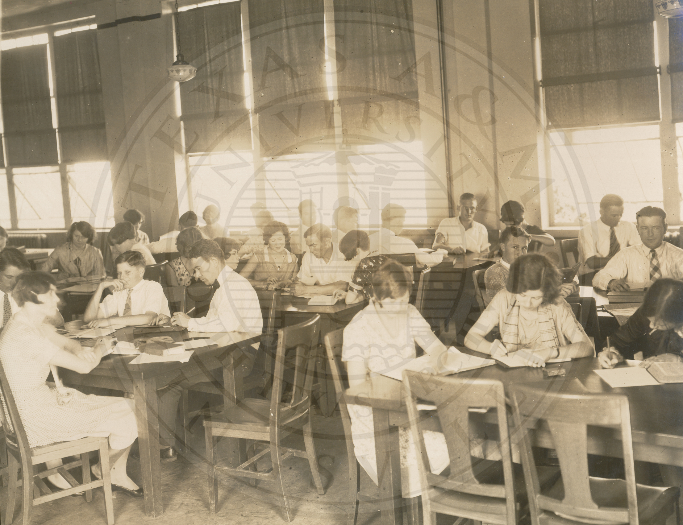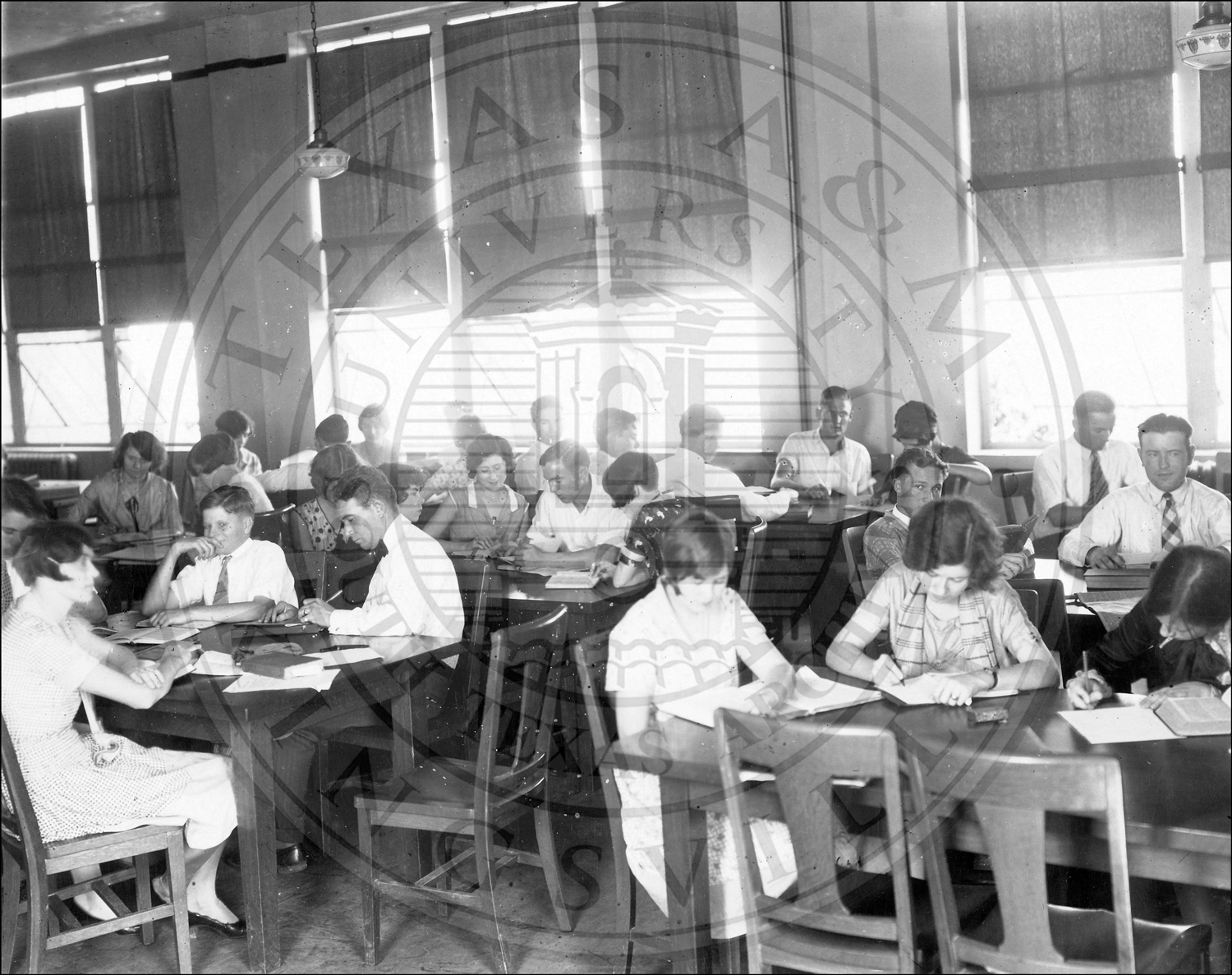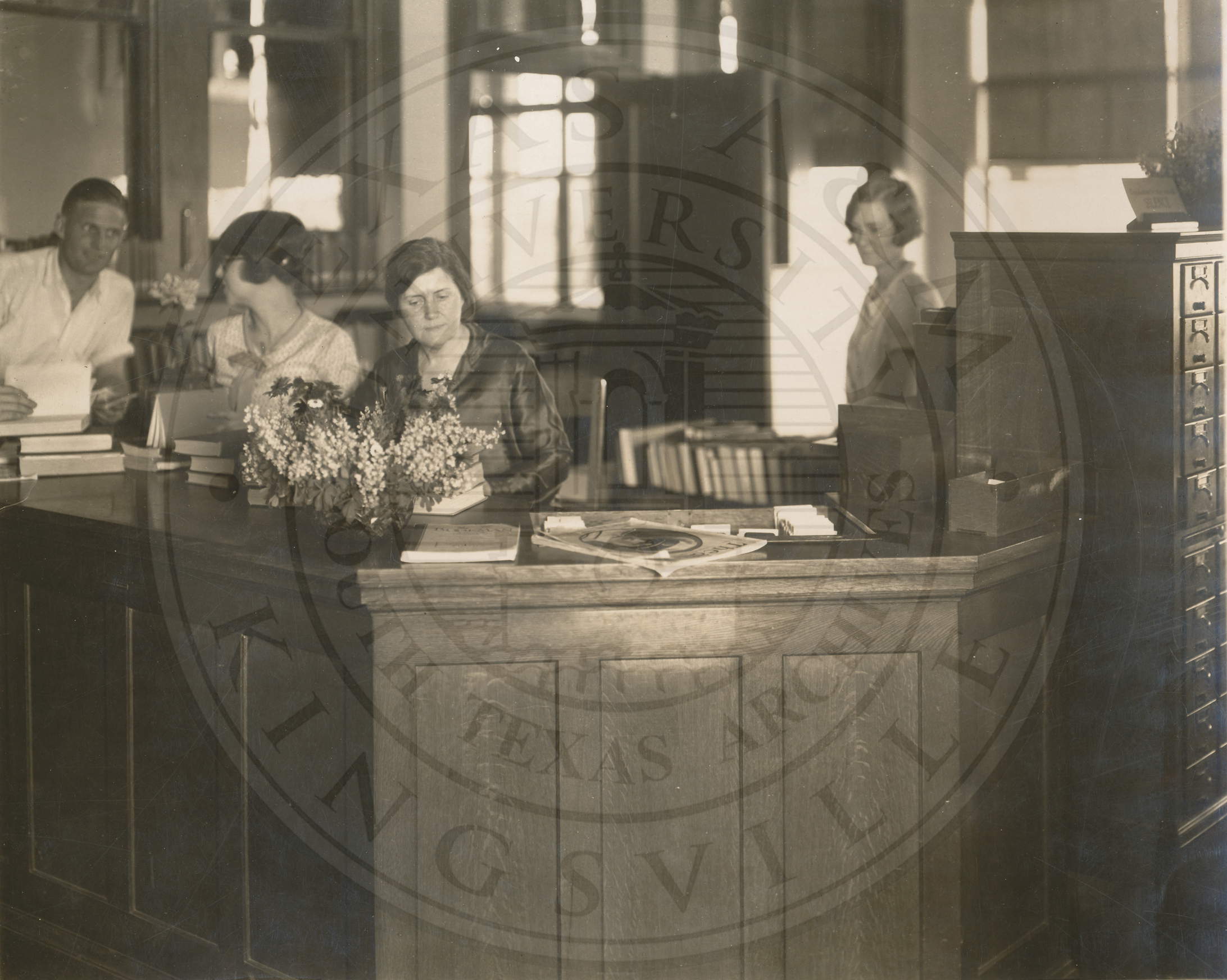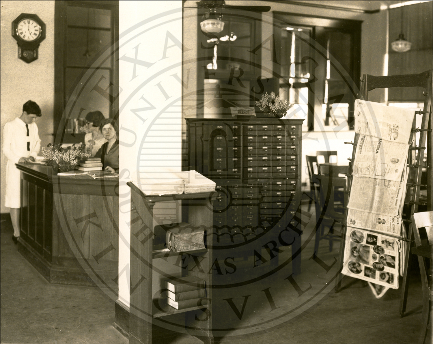 South Texas State Teacher's College library. Woman at circulation desk in dark dress is the institution's first librarian, Ann Kirven. The card catalog & newspaper are rack are visible in the image. |