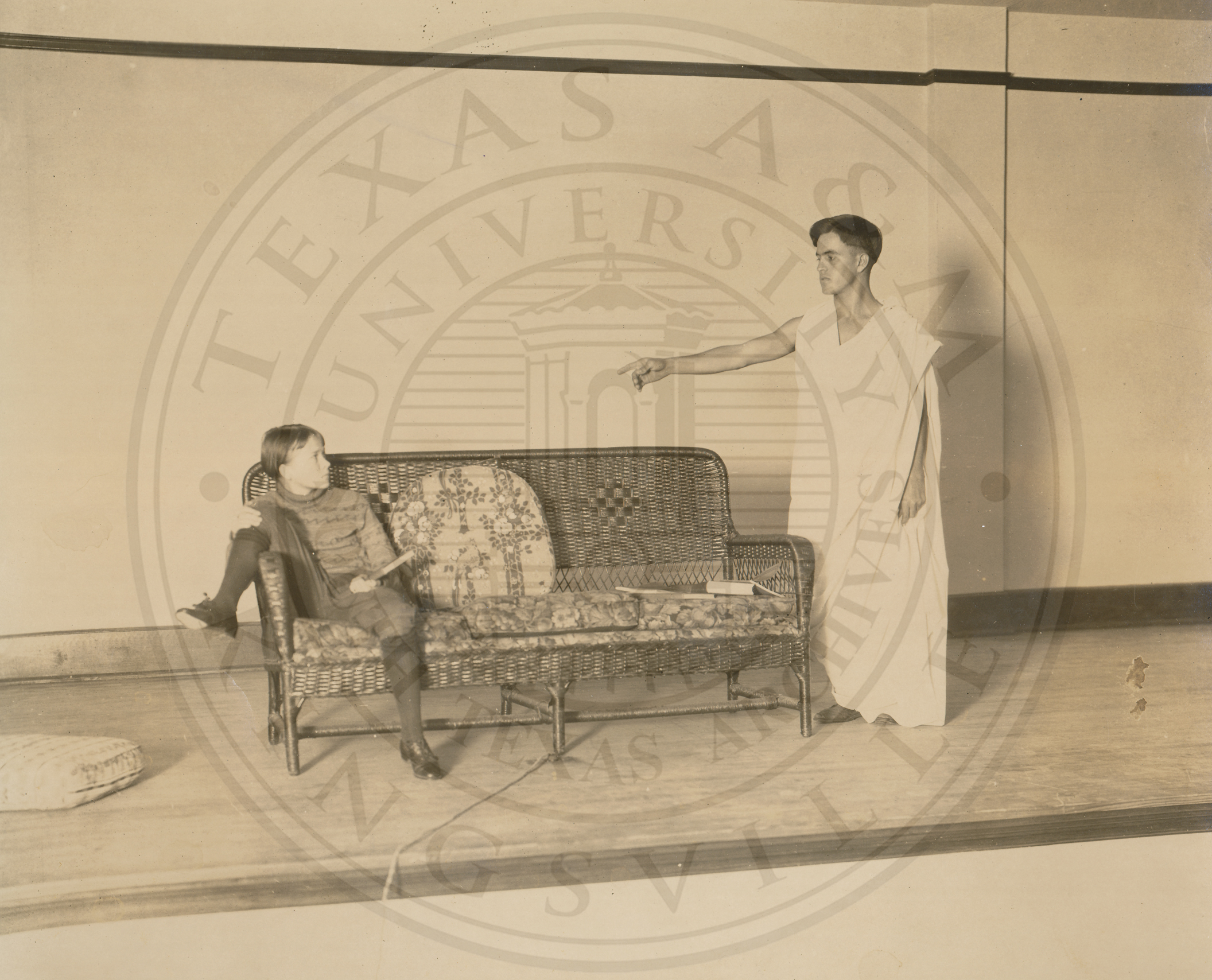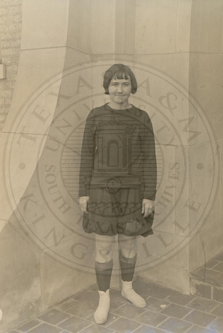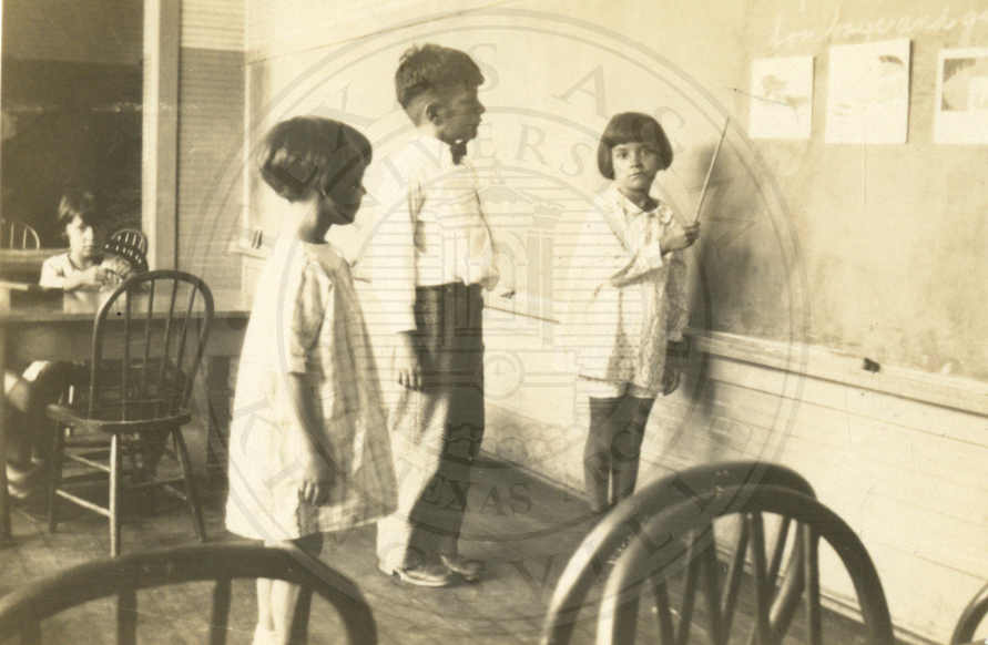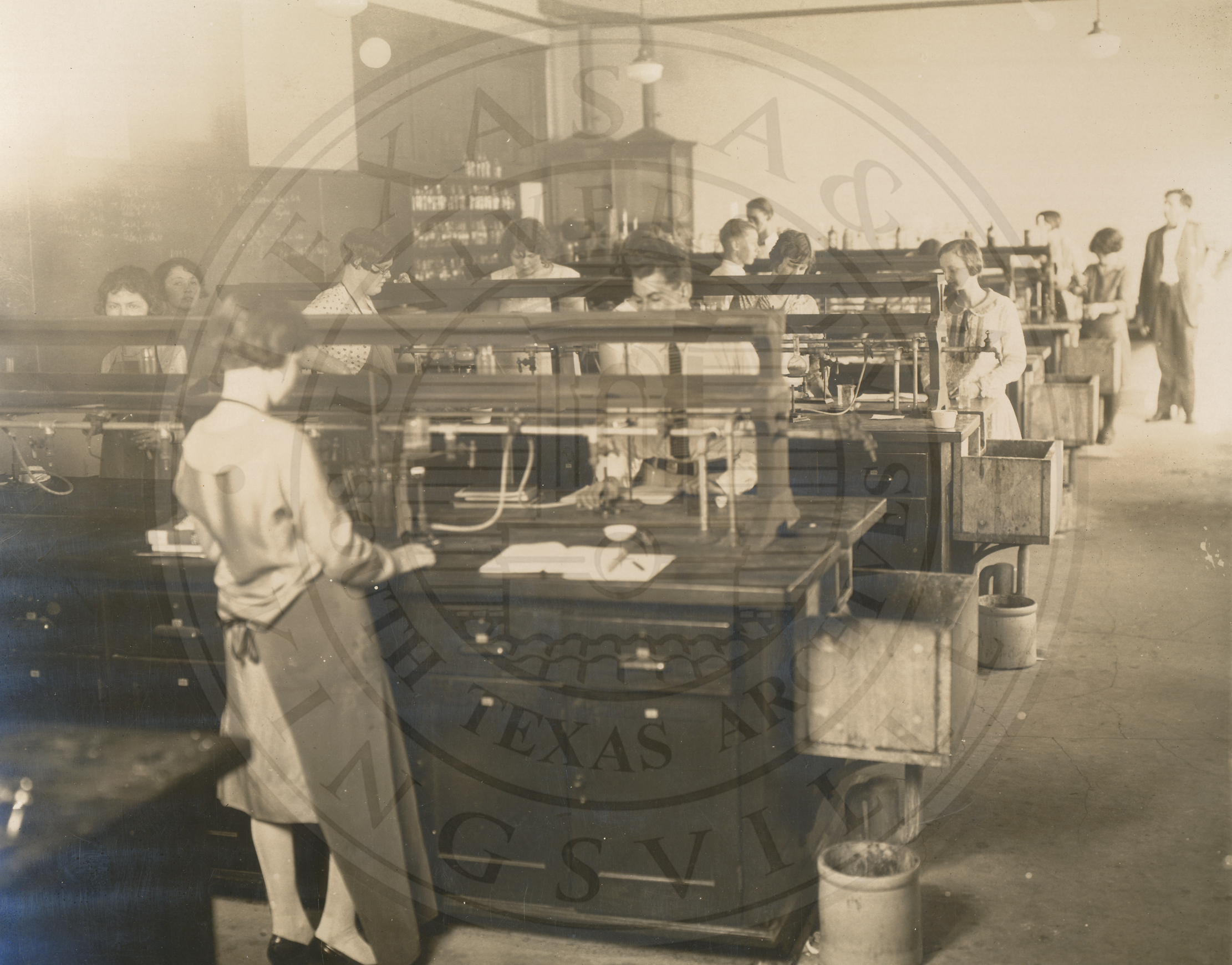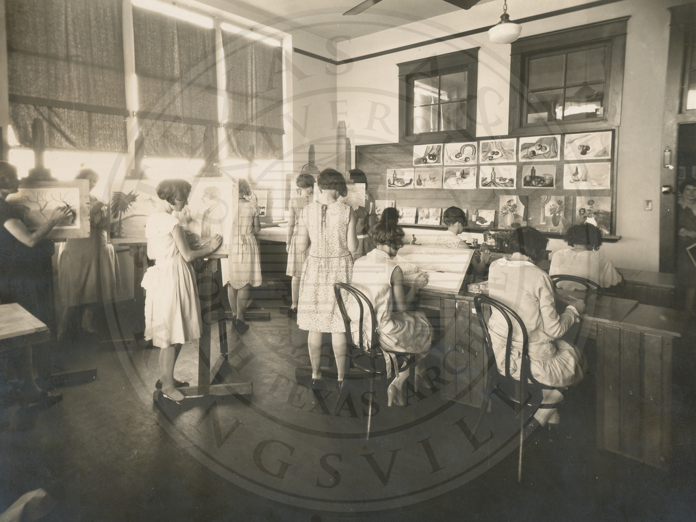 South Texas State Teacher's College library. Woman at circulation desk in dark dress is the institution's first librarian, Ann Kirven. The card catalog & newspaper are rack are visible in the image. |