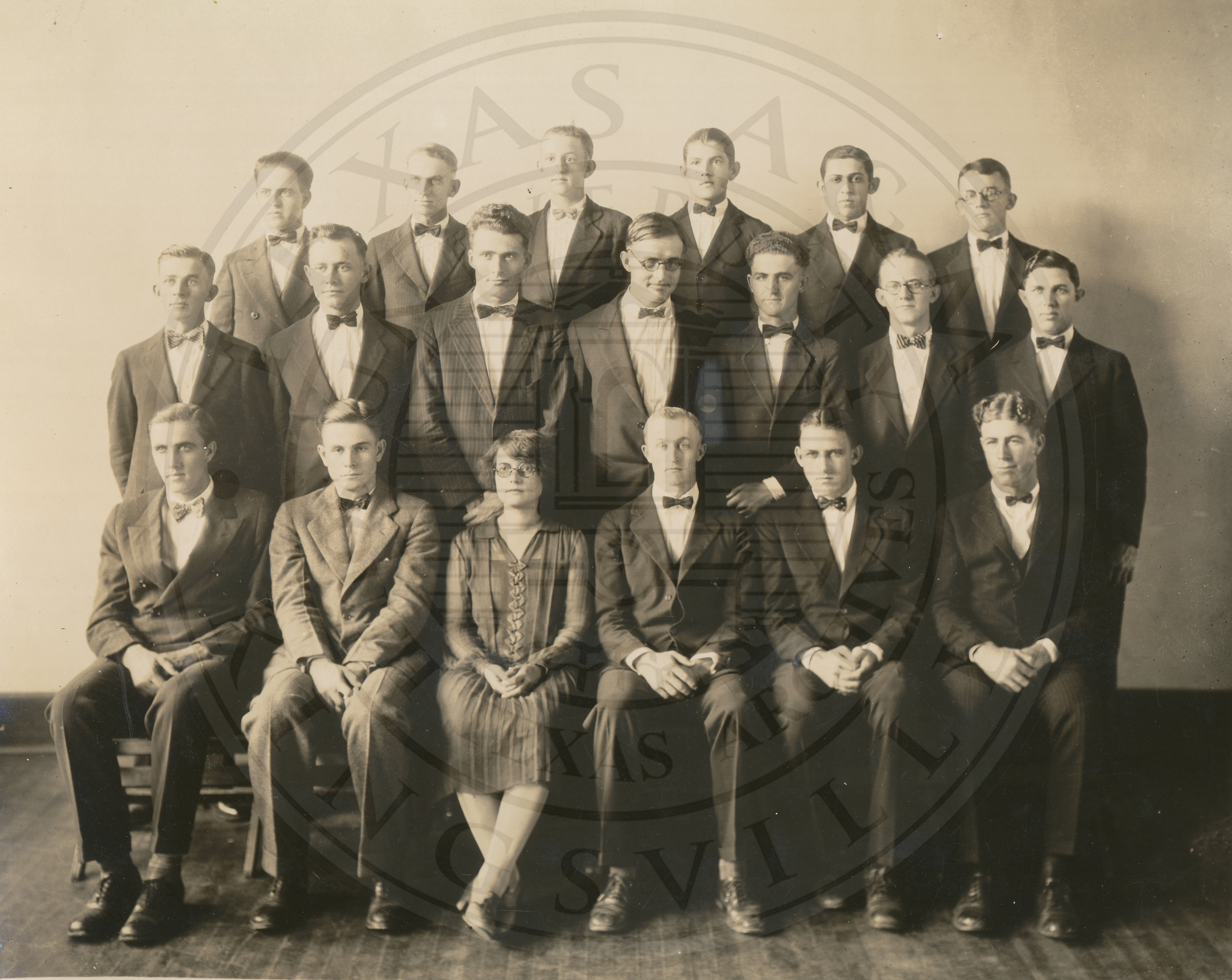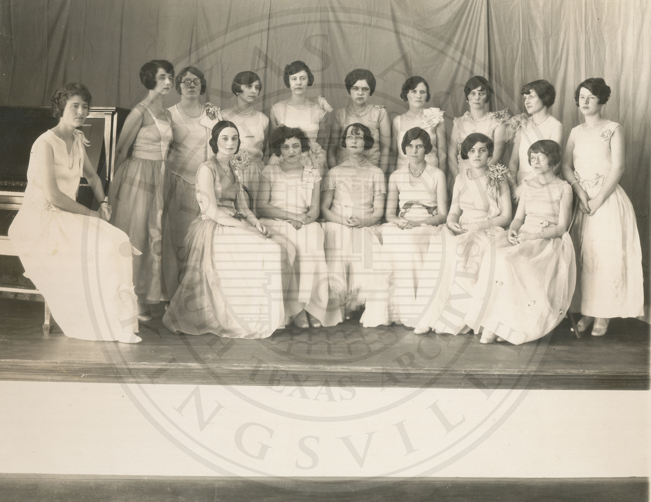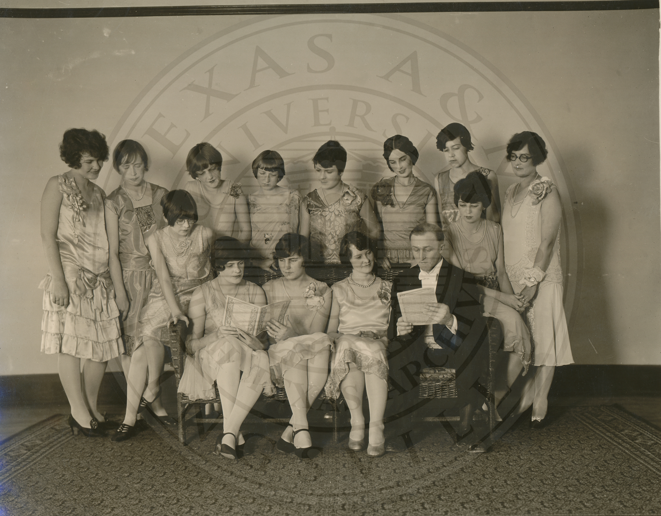 Treble Clef Club (girls chorus). L to R: Addie Barrett, Florence Norquest, Buelah Barber, Jane Firnhaber, Francis Beaver, Ann Price, Wilma McAferty, Ethel Mayfield, Clovis Hickman, Marian Wood, Marie Rooth, Crystal Robertson, AmosE. Engle (Director), Willa Woodside. |