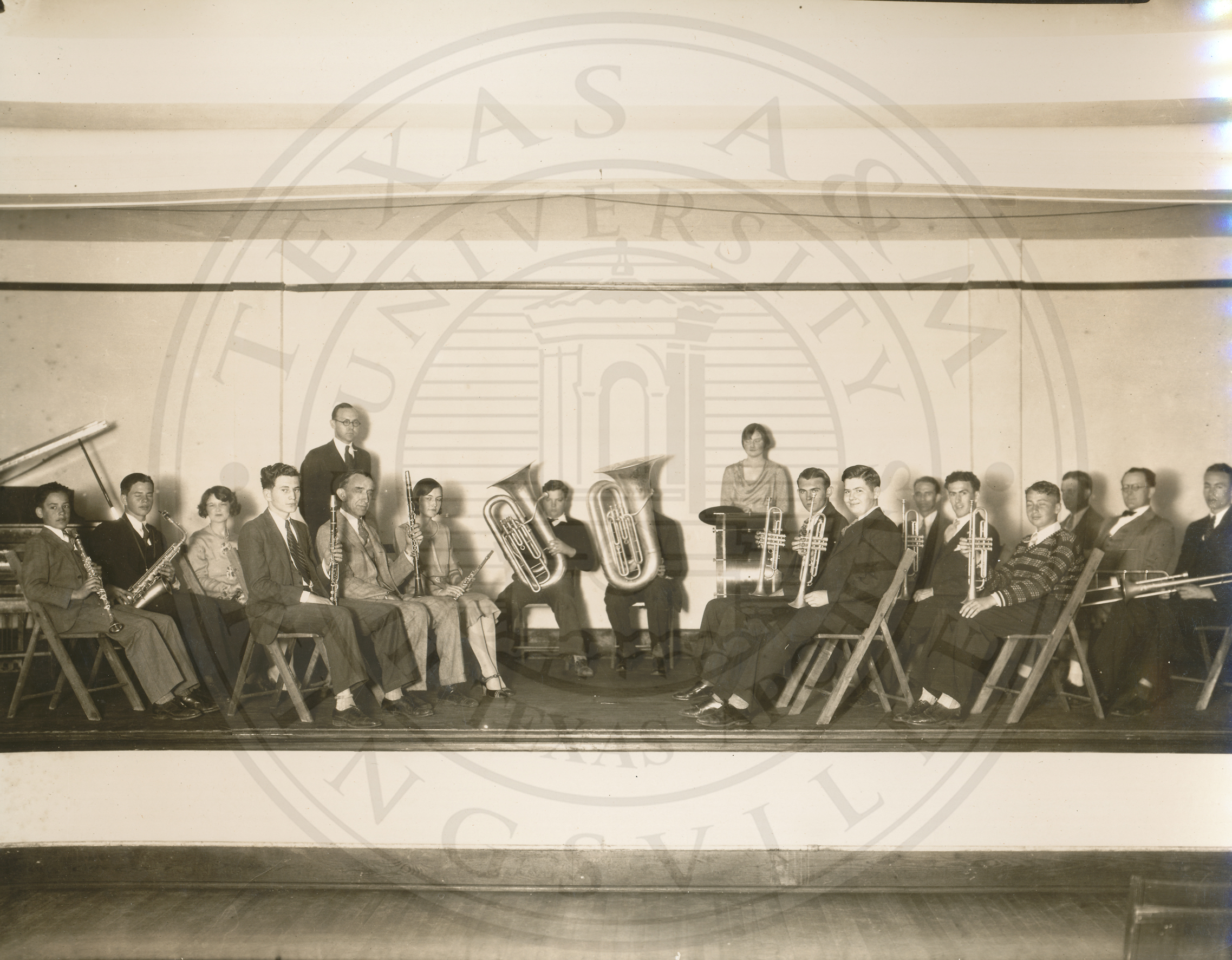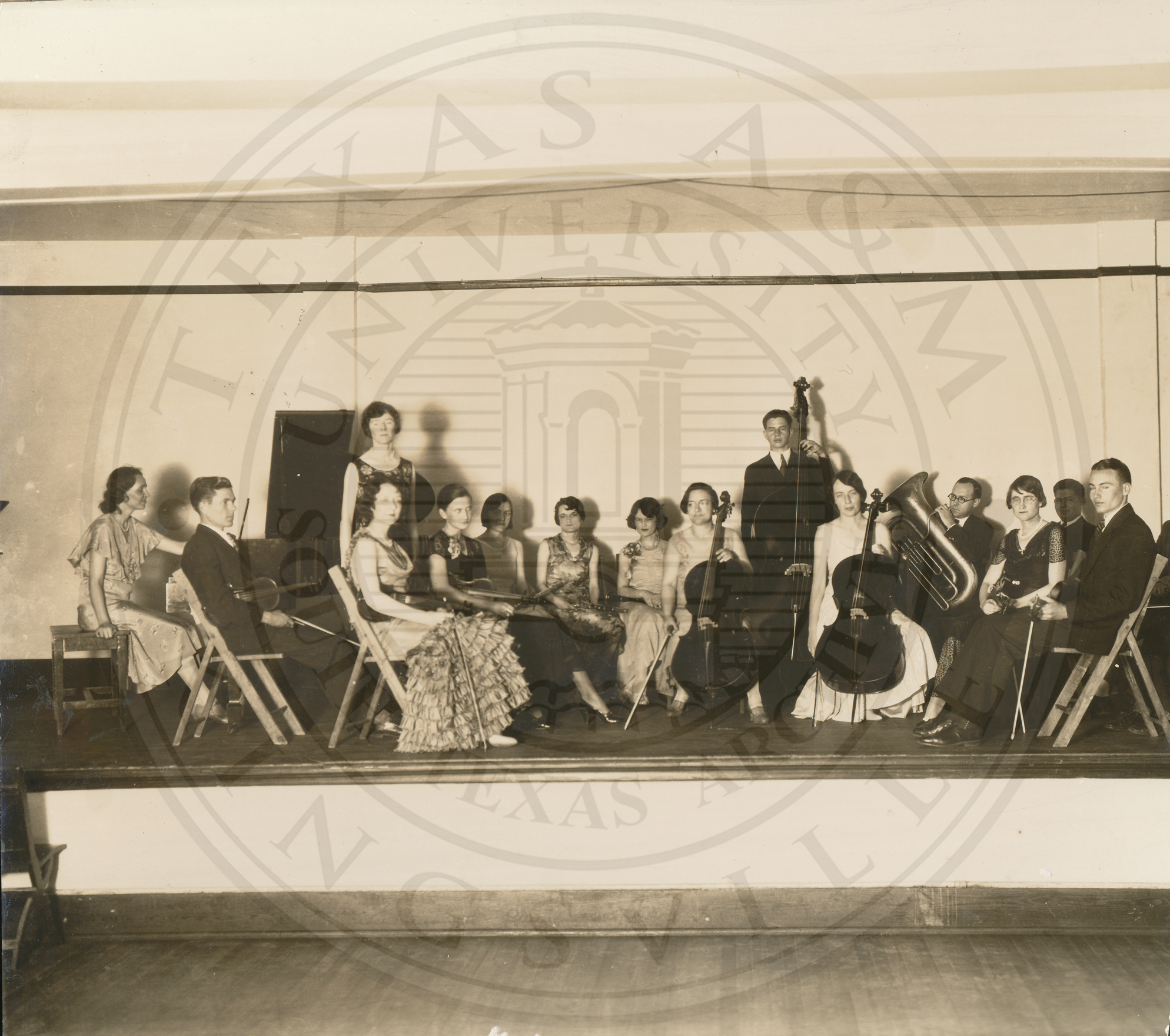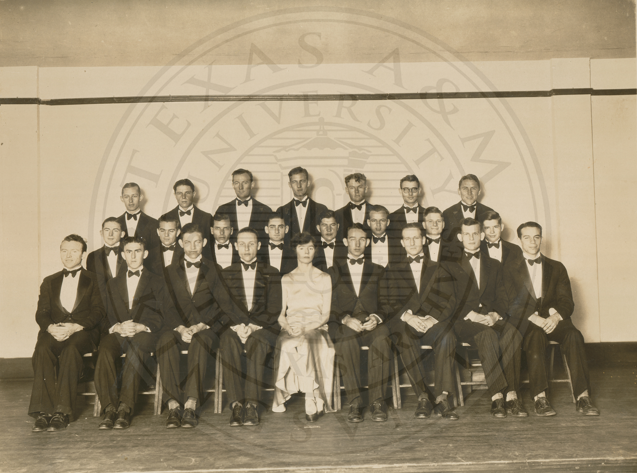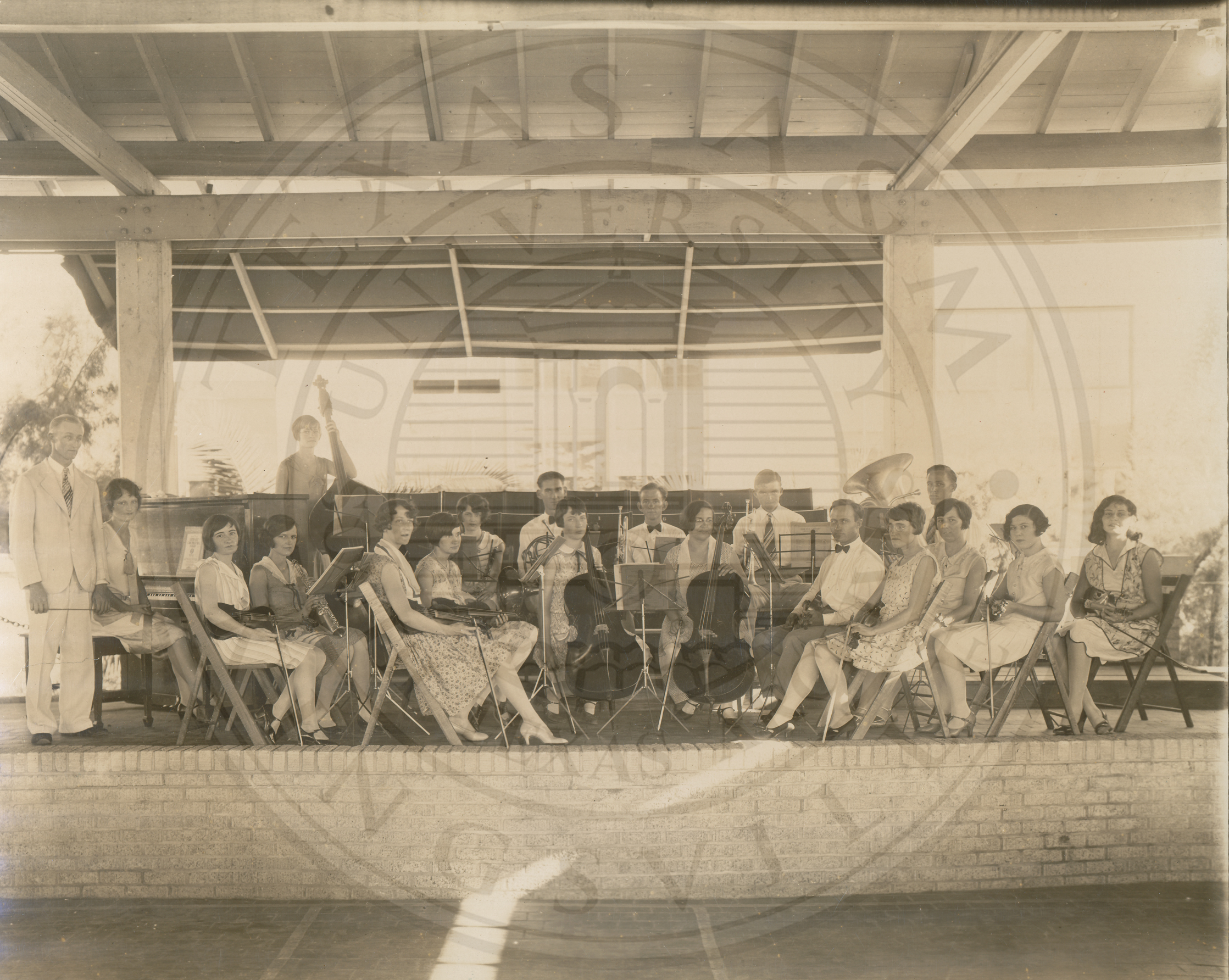 Treble Clef Club (girls chorus). L to R: Addie Barrett, Florence Norquest, Buelah Barber, Jane Firnhaber, Francis Beaver, Ann Price, Wilma McAferty, Ethel Mayfield, Clovis Hickman, Marian Wood, Marie Rooth, Crystal Robertson, AmosE. Engle (Director), Willa Woodside. |