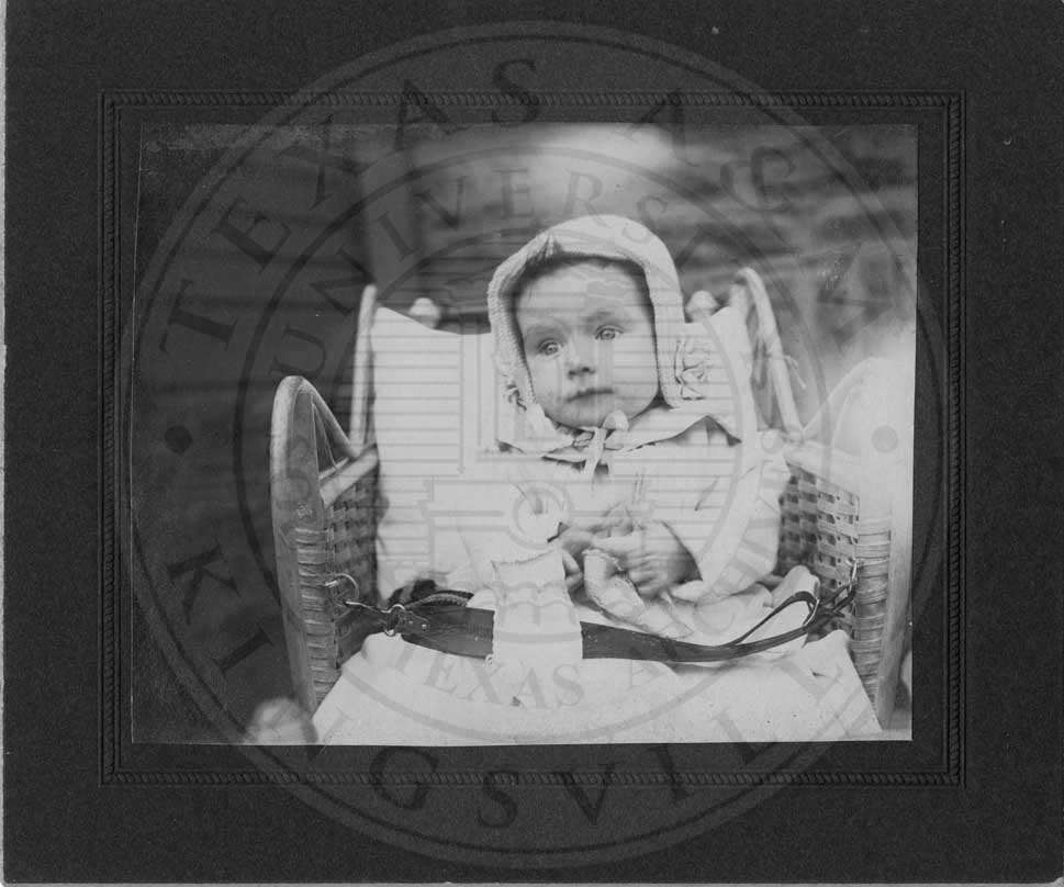 Portrait of an unidentified baby sitting in a wicker stroller. |
