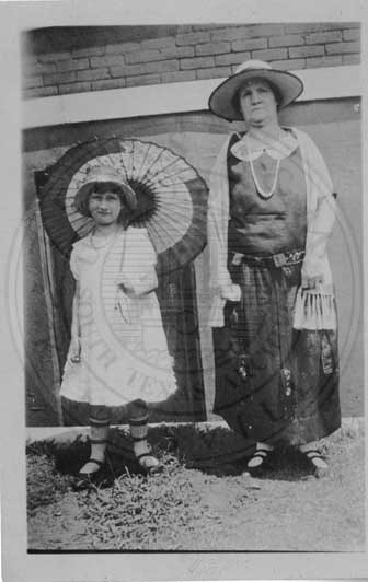 Photograph of an unidentified woman and young girl. The girl has a parasol. |
