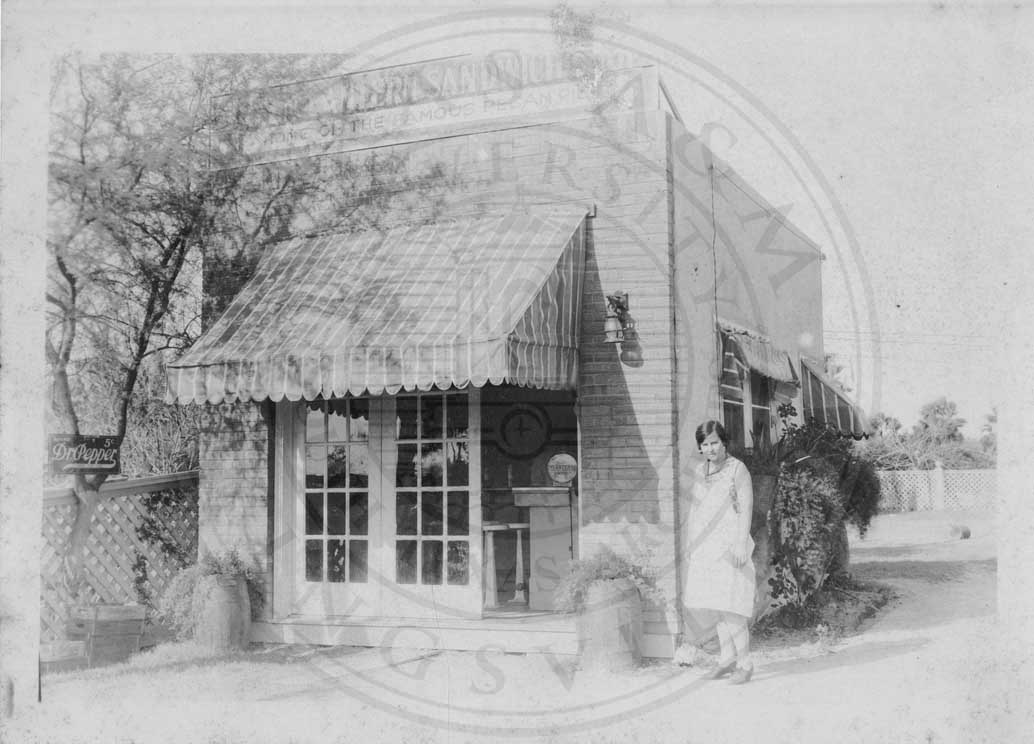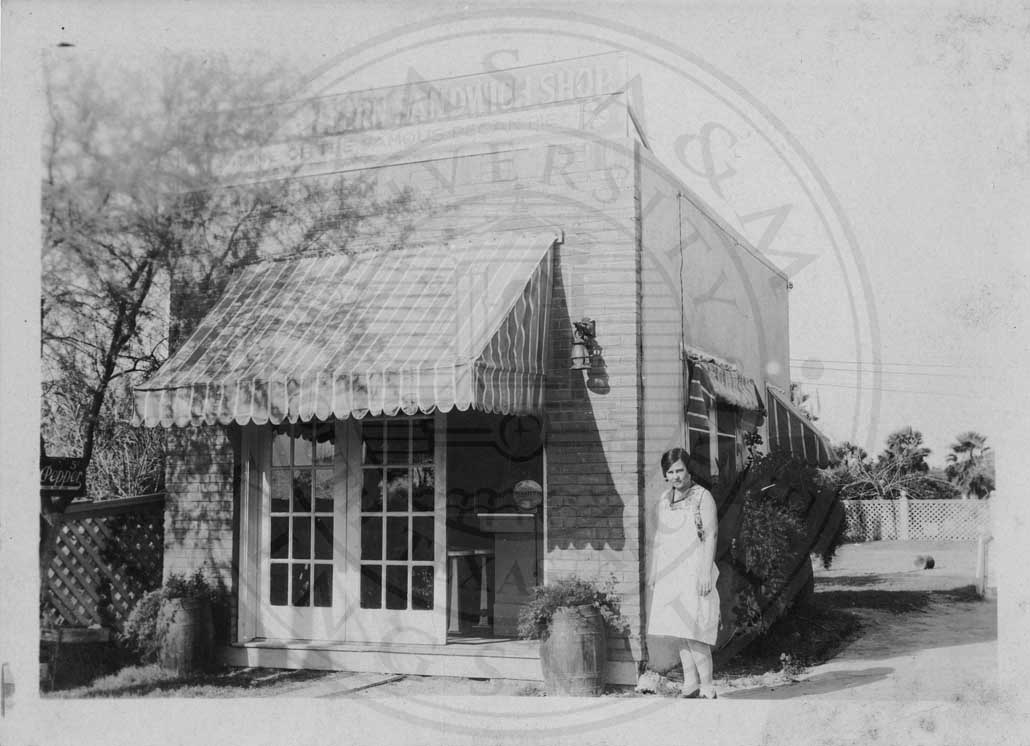 Photograph of an unidentified woman, wearing an apron, standing outside a shop. Same photograph as item 067. Caption on back, "Green Lantern Sandwich Shop, 3-12-1930, Mission, Texas." |