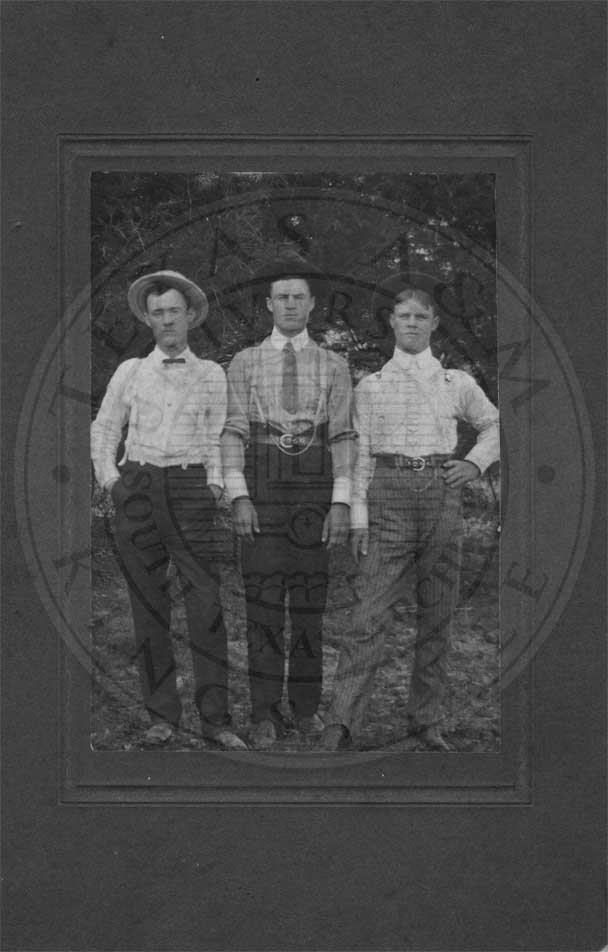Photograph of three unidentified men. Man, second to left, Oliver S. Watson? |