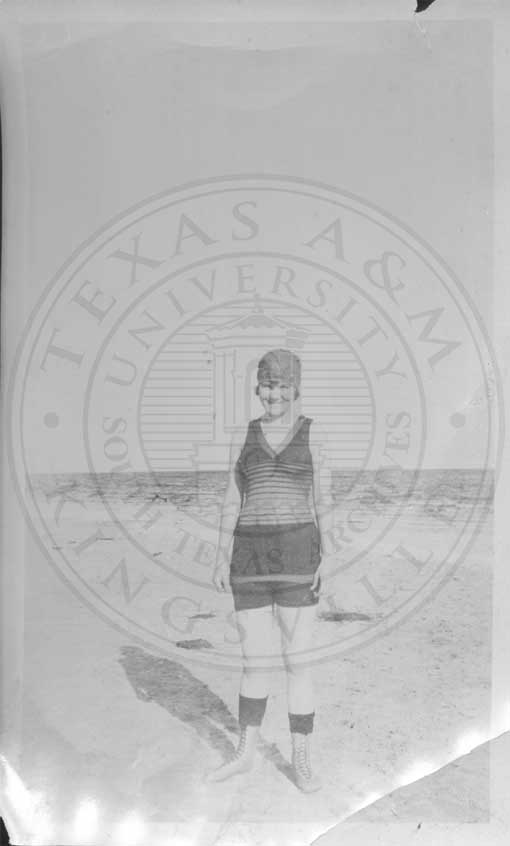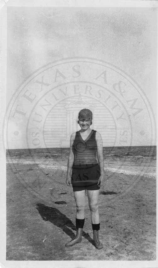 Photograph of Mabel Watson in a bathing suit at the ocean. |