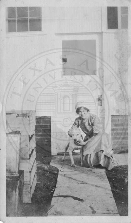 Photograph of Mabel Watson petting a dog. |